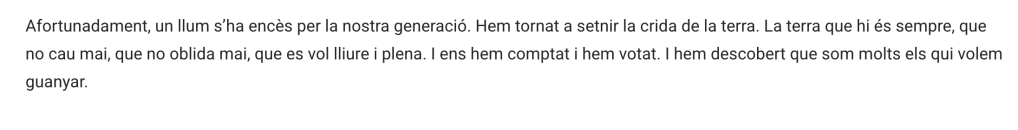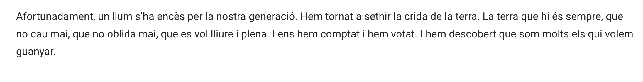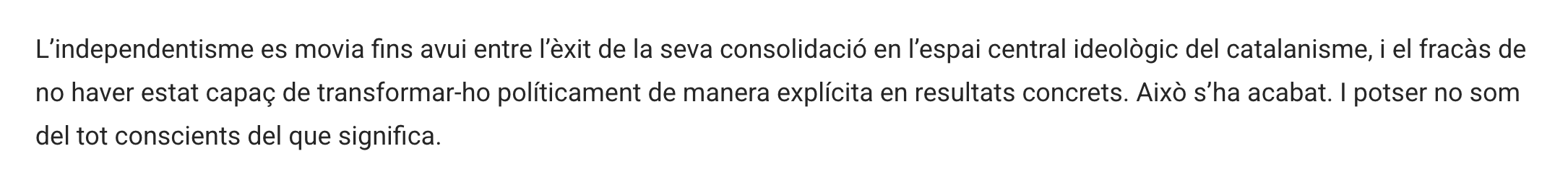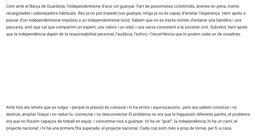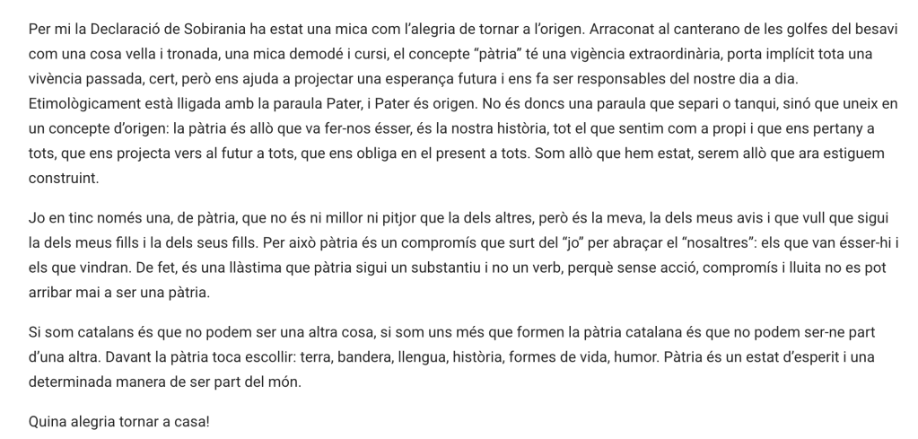 Y dos artículos del antepenúltimo presidente de la Generalitat, Joaquim Torra. El primero, del año 2015, en el que dice que los catalanes llevan 289 años aguantando lo que ningún pueblo civilizado ha soportado. España ejerce su derecho de conquista y humilla con el desprecio más descarnado; lo que ha de conducir a recuperar la «patria», un concepto excluyente (si tenemos una patria, la catalana, no podemos tener ninguna otra) que da sentido a la lucha.