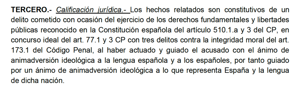 Se dan, por tanto, las circunstancias necesarias para que deba vigilarse en Cataluña el discurso que tiene por objeto fomentar la hostilidad o el desprecio hacia «los castellanos», España, la identidad española, incluida su lengua. No es un capricho, sino que responde a la existencia real de limitaciones de derechos conectadas a la pertenencia de los individuos a un determinado grupo, un grupo que se identifica, de manera precisa, por su oposición a los planteamientos nacionalistas catalanes de acuerdo con lo que se ha explicado hasta aquí.