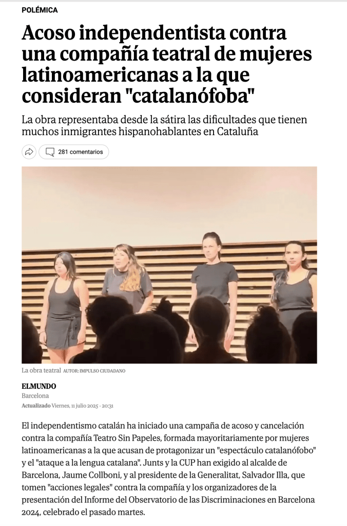Más recientemente, un grupo de teatro aficionado también fue boicoteado como consecuencia de una obra de teatro en la que cuestionaba la politica lingüística en Cataluña.