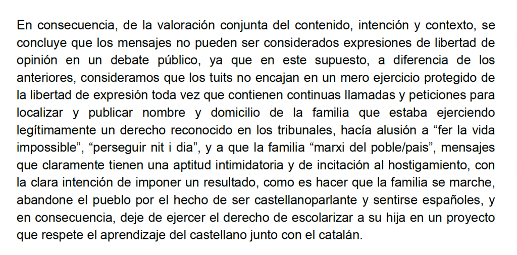 En el caso que nos ocupa ahora, esas limitaciones de derecho, por pertenecer a colectivos que discrepan de los planteamientos nacionalistas existen. Recientemente, se ha declarado judicialmente que los mensajes hostiles hacia quienes se identifican con la lengua castellana y la nación española pueden ser constitutivos de delito de odio. El pronunciamiento se hace en relación al acoso sufrido por la familia de Canet de Mar que obtuvo una decisión judicial que garantizaba a su hija una educación en la que estuviera presente tanto el catalán (75%) como el castellano (25%); lo que motivó que se exigiera en redes sociales identificar a la familia para que tuviesen que marcharse. Es decir, la identificación como castellanoparlantes y el sentimiento de españolidad fue determinante para que se intentase limitar sus derechos.