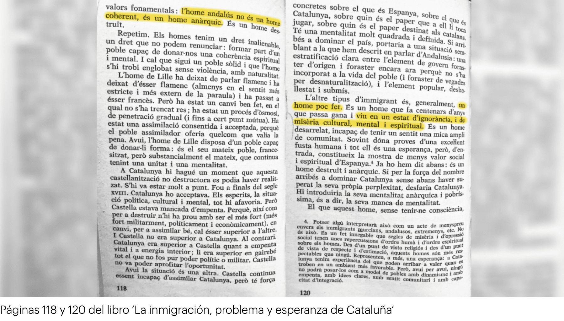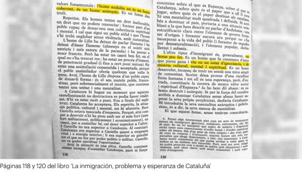 In other words, the stigmatization of Spain (understood as an entity to which Catalonia should not belong) and of non-Catalan Spaniards (“Castilians”) is an essential part of Catalan nation-building; both through a particular interpretation of history and through the reaction to the arrival of workers from other parts of Spain in the mid-twentieth century—a reaction in which stereotypes about the supposed “superiority” of Catalans (cultured, enterprising, hardworking, and peaceful) over “Spaniards” (uncultured, lazy, primitive, and violent) took hold in certain segments of society. The fact that leaders such as Jordi Pujol or Quim Torra expressed such ideas openly, even in writing, is evidence of this.