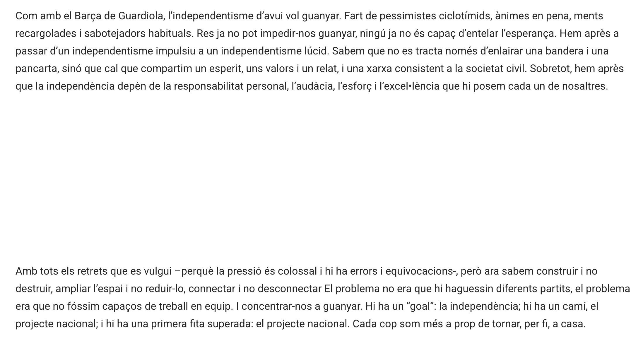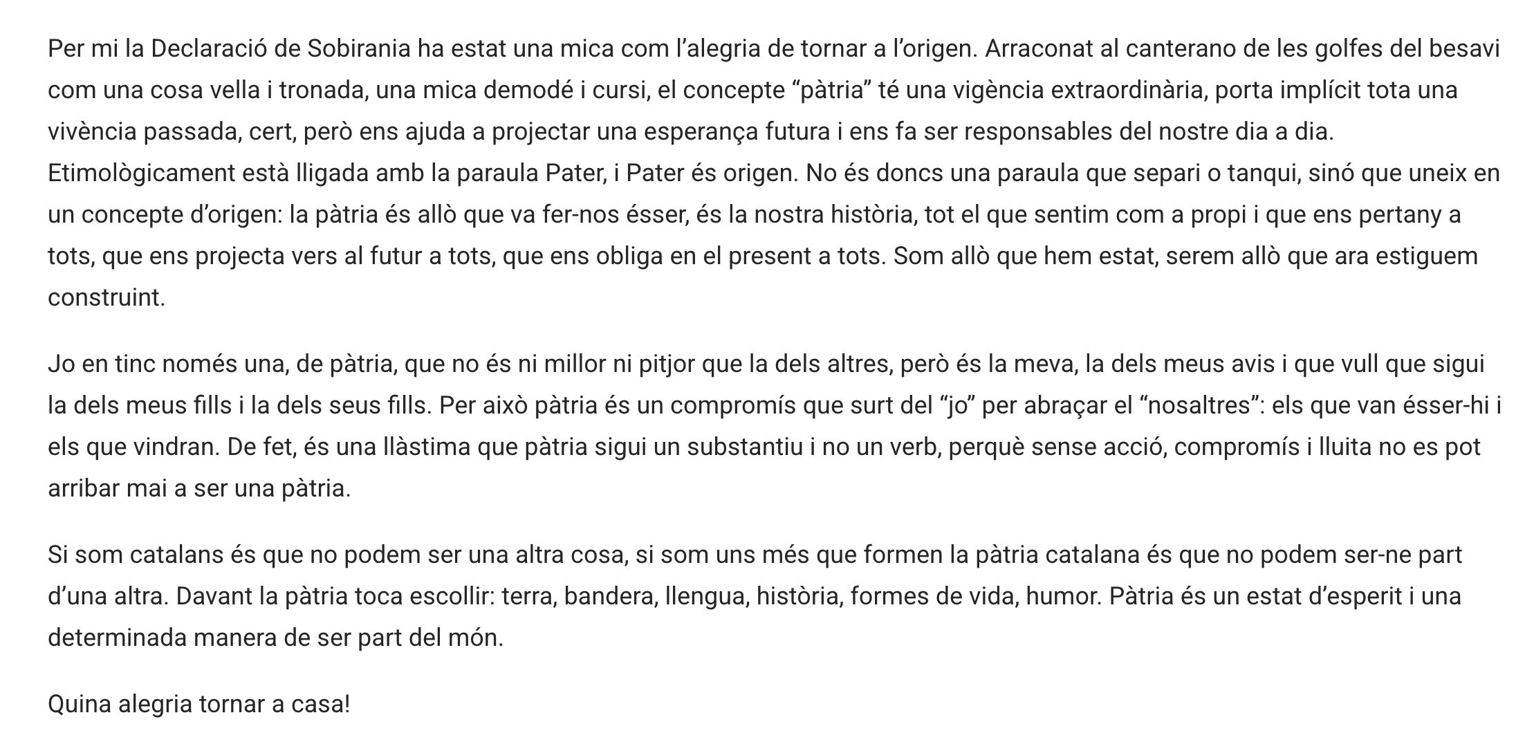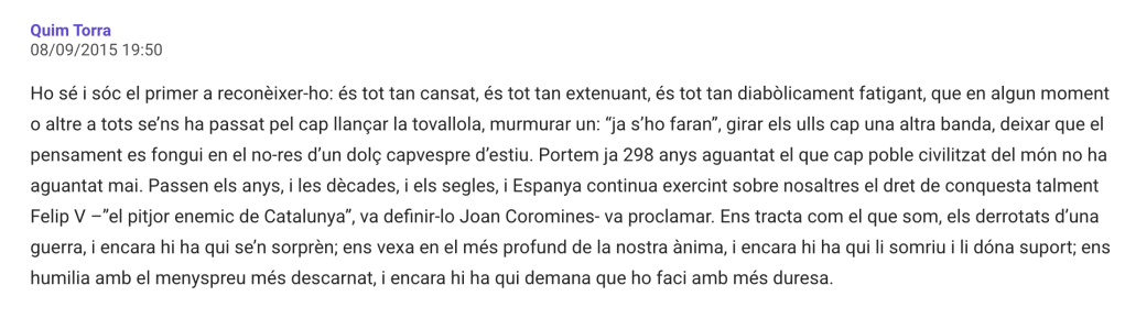 And two articles by the third-to-last President of the Generalitat, Quim Torra. The first, from 2015, in which he states that Catalans have spent 289 years enduring what no civilized people has ever endured. Spain exercises its right of conquest and humiliates with the harshest contempt; a situation that must lead to the recovery of the “homeland,” an exclusionary concept (if we have one homeland—the Catalan one—we cannot have any other) that gives meaning to the struggle.