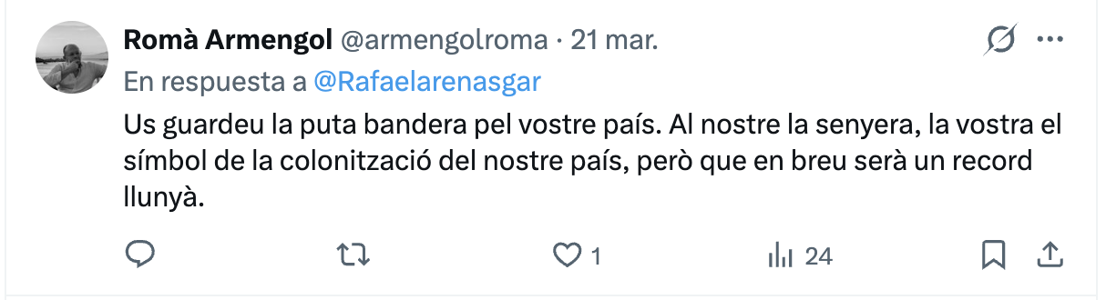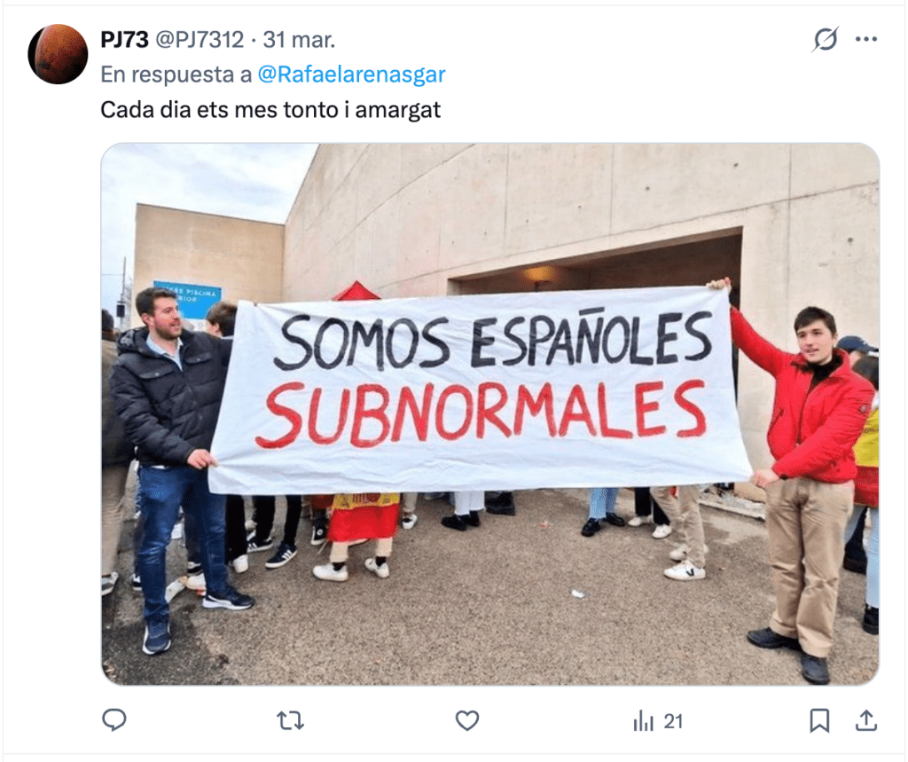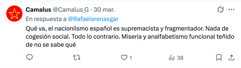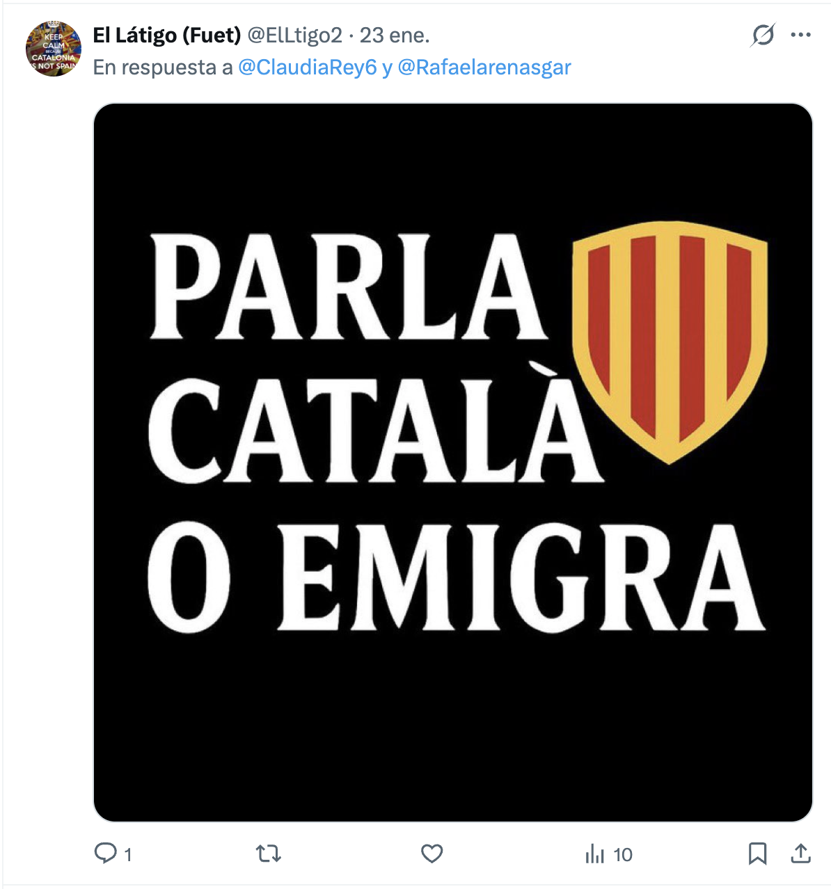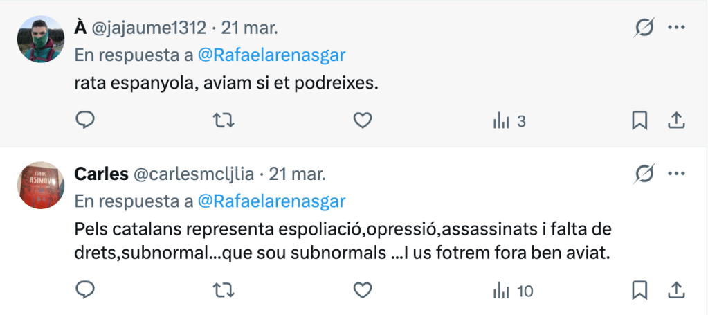 From this perspective, it is inconceivable that insults directed at “Spaniards” or threats on social media would be prosecuted or investigated as hate speech. In such cases, they are regarded as legitimate exercises of freedom of expression, whereas any criticism of nationalism is liable to be portrayed as Catalanophobia—because here, it is considered necessary to ensure that freedom of expression does not become hate speech.