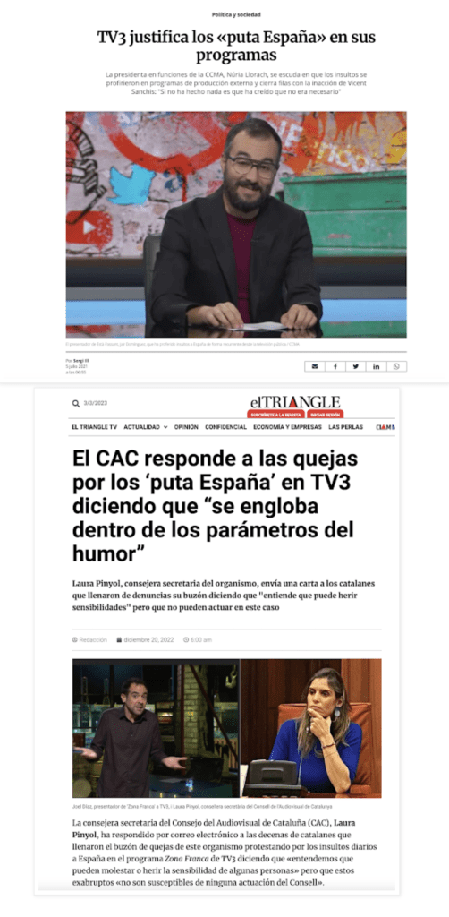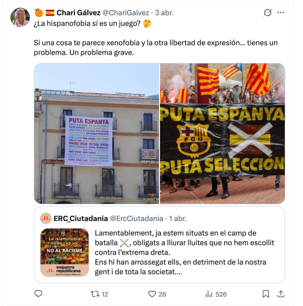 According to this nationalist framework, there is no symmetry between Catalanist positions and—not even “Spanish nationalist” ones—but simply those that defend equality of rights and the validity of constitutional principles. Meanwhile, slogans such as “Puta Espanya” may even receive a degree of institutional tolerance.