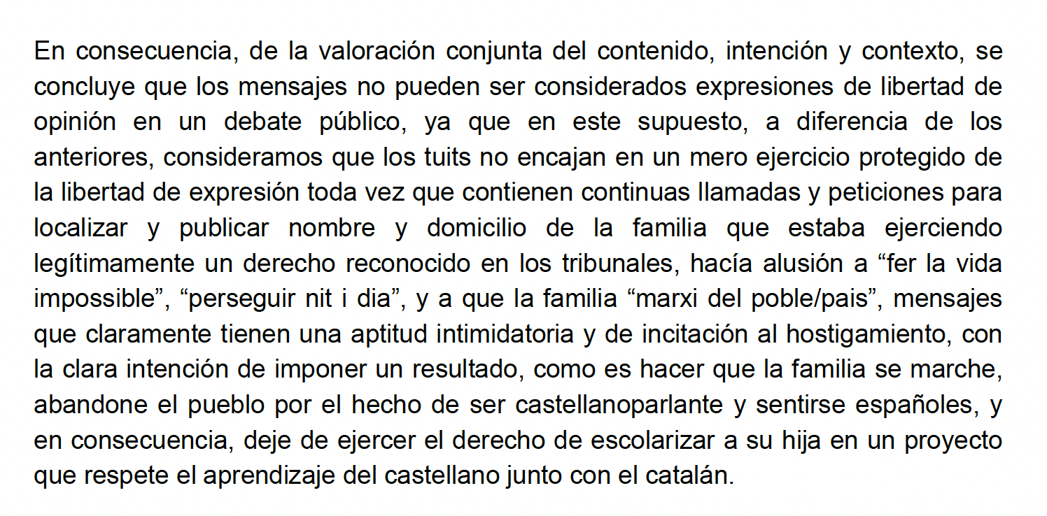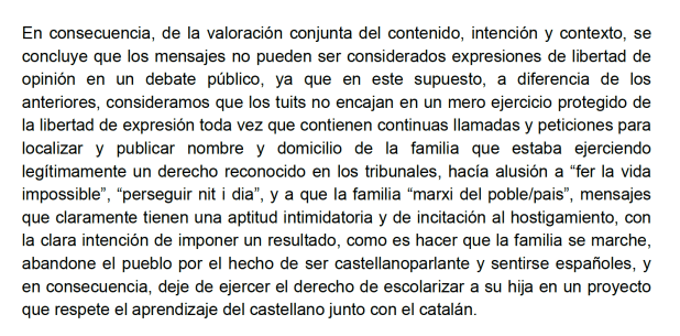 In the case at hand, such limitations of rights—affecting those who belong to groups that dissent from nationalist positions—do exist. Recently, it has been judicially established that hostile messages directed at those who identify with the Spanish language and the Spanish nation may constitute hate speech. This ruling relates to the harassment suffered by the family in Canet de Mar who obtained a court decision guaranteeing their daughter an education in which both Catalan (75%) and Spanish (25%) would be present; this led to calls on social media to identify the family so that they would be forced to leave. In other words, their identification as Spanish speakers and their sense of Spanish identity were decisive factors in attempts to restrict their rights.