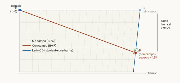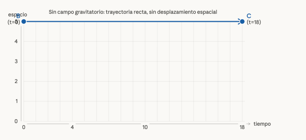 In other words, the object naturally tends to fall. I would like to point out that the fall is not oblique, but perpendicular, because the graph shows displacement in spacetime. What the graph indicates is that at second 1, the object is at point 4.8 (approx.); at second 2, it is at point 4.6… and at second 17, it is at point 1.7 (approx.). That is, the graph represents a fall from a height of 5 meters (for example) to 1.7 meters in 17 seconds. Of course, these figures do not correspond to any real fall on Earth; they are intended to show that the «downward» movement of objects—that is, toward gravitational masses—is an inevitable consequence of two things: first, that objects tend to follow the shortest path in spacetime; and second, that time passes more slowly near gravitational fields.