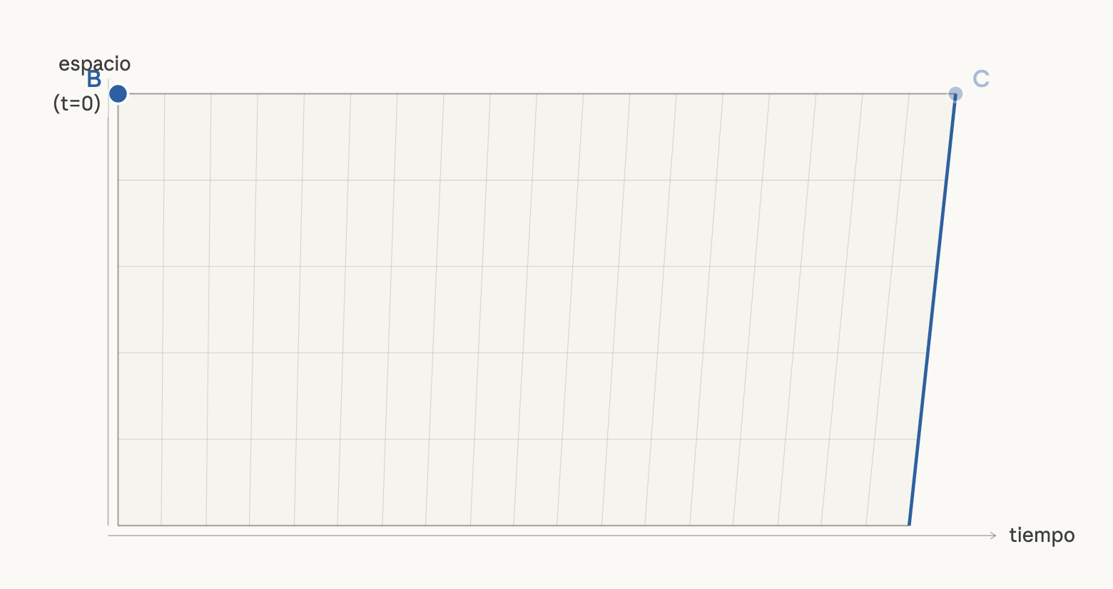 Another thing we must keep in mind is that an object always follows the shortest path in spacetime. In the previous image, the object is initially in the grid square defined by points (0,5), (1,5), (1,4), and (0,4) and must move to the grid square defined by points (1,5), (2,5), (2,4), and (1,4). The shortest line to reach that square is the one drawn by the blue line. As we have seen, this is a line that translates into movement in time, not in space.