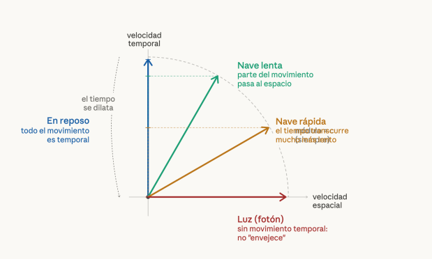 It has to do with the fact that all objects move through spacetime with a constant «velocity.» If the object (or particle) has no temporal displacement (it does not «age»), all its movement is transferred to space, and it moves at the maximum possible speed: the speed of light, hereafter referred to as c If the object is completely still in space, all its displacement occurs in time. This is what happens to us, as we are practically at rest (although the Earth moves through space at a speed of several hundred kilometers per second relative to the cosmic background, that speed is irrelevant compared to c).
