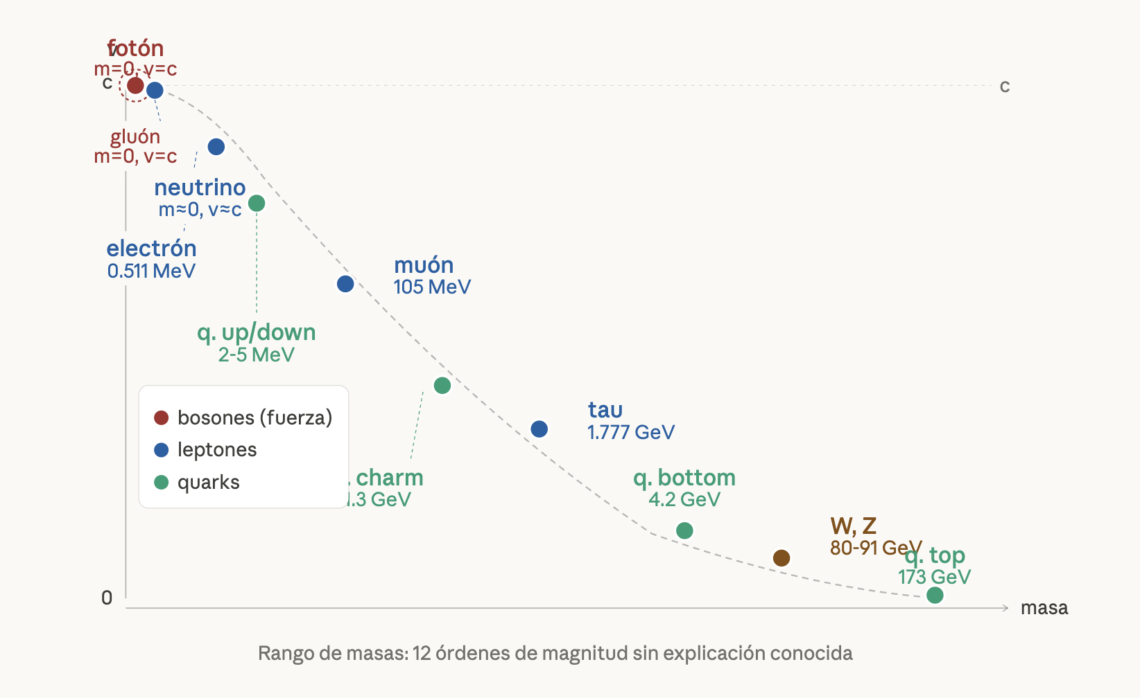 And here we come to something curious: as can be seen, the photon has no temporal movement; and this is related to the fact that it lacks mass. That is, there is a relationship between mass and the orientation of the movement vector. Bodies (or particles) with mass move through time, whereas massless particles only move through space. In a way, mass is the measure of a particle’s anchorage in time; the greater the mass, the greater the displacement in time and the smaller the displacement in space. It could be said that mass is the vibration in time of particles or objects. Since the total displacement must be constant (nothing can be simultaneously still in both time and space), the mass of elementary particles and their natural velocity are related, as can be seen in the following graph: