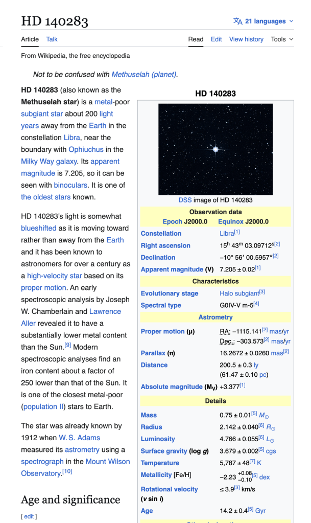 Based on a star’s composition, it is possible to measure its approximate age. The curious thing is that there are some stars that appear to be older than the universe itself. The most famous is known as the Methuselah star, located about 190 light-years from Earth. A few years ago, its age was estimated at 15 billion years—more than a billion years older than the age of the universe. While more recent measurements have reduced this estimate, it still sits right on the very edge of the moment the universe was created.