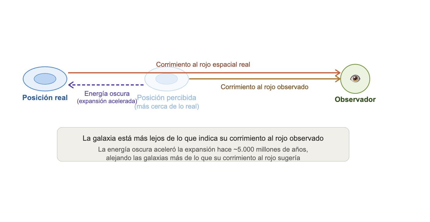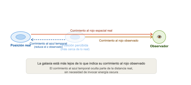In the framework of temporal slowing, this would imply that the redshift of galaxies deriving from spatial expansion is partially offset by this temporal blueshift. The result is that the observed redshift does not measure the full displacement of the galaxy, as it loses part of its effect due to this temporal shift. Consequently, distant galaxies are actually farther away than the redshift indicates; meaning the brightness of supernovas matches their true distance if we account for both spatial expansion and the slowing of time.