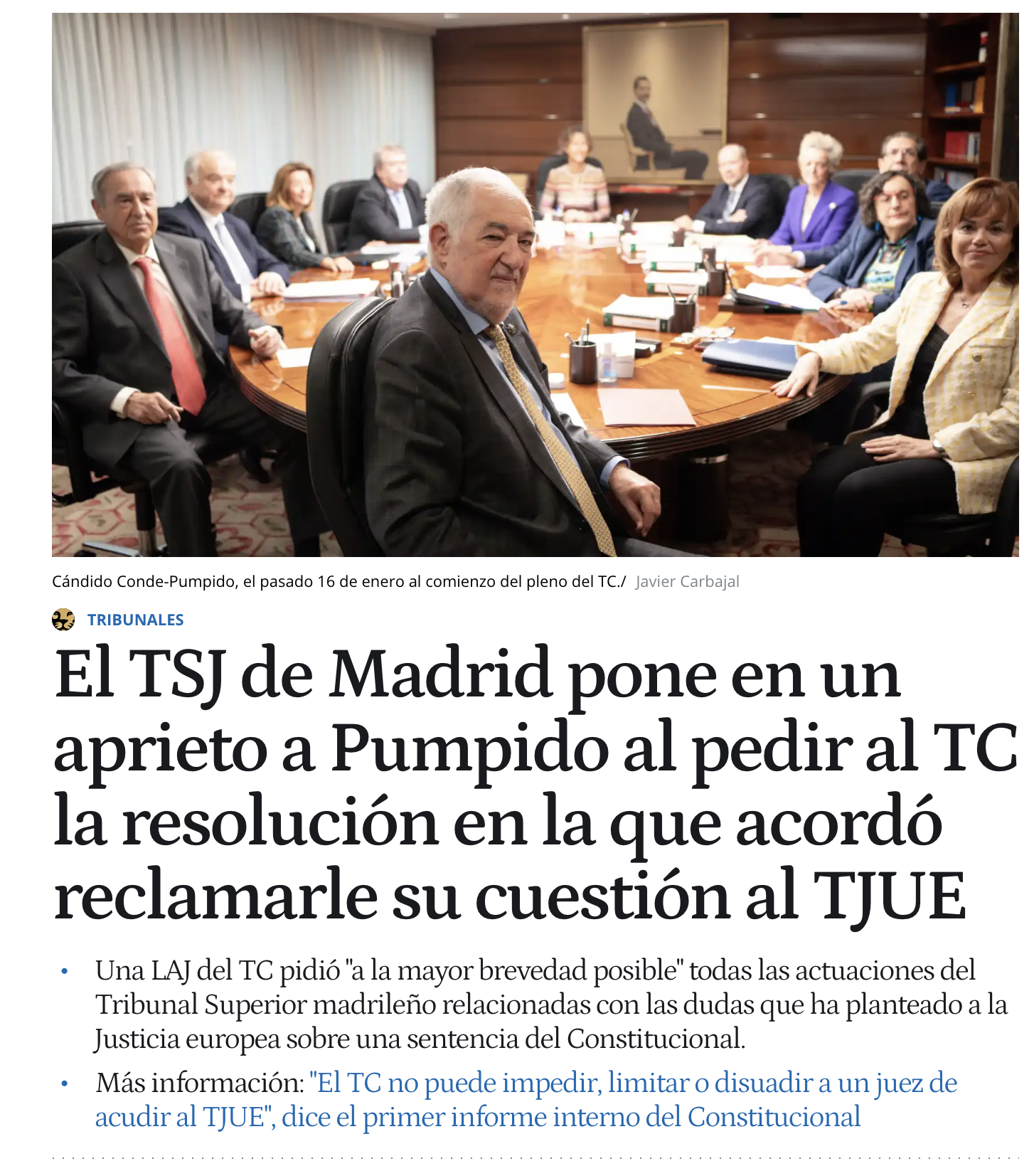 A lo anterior hay que añadir que ningún órgano jurisdiccional puede verse condicionado en su aplicación del derecho de la UE, incluyendo la posibilidad de plantear cuestiones prejudiciales cuando lo estime oportuno. El caso que nos ocupa nos permite apreciar que sin estas exigencias del derecho europeo no sería impensable una actuación exorbitante del TC que, incluso con los límites que impone la UE, no es completamente descartable.