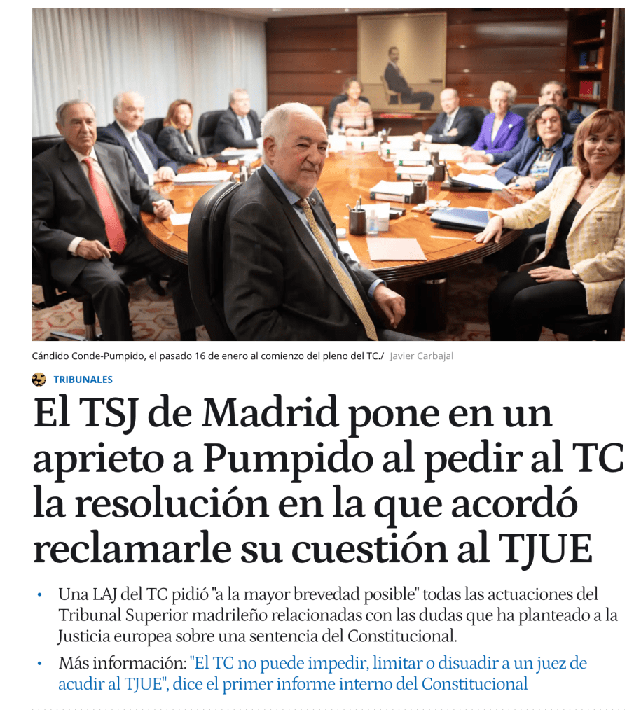 En ambos casos, la chispa que enciende la disputa es el planteamiento de una cuestión prejudicial ante el Tribunal de Luxemburgo en relación a doctrina constitucional. En el caso del TSJ de Madrid, la cuestión se plantea por medio de Auto de 20 de marzo de 2025, tras haber anulado el TC por medio de su sentencia 146/2024, de 2 de diciembre, la del TSJ de Madrid 66/2021, de 22 de octubre, que había anulado parcialmente un laudo arbitral por no haber aplicado este último el art. 101 del Tratado de Funcionamiento de la Unión Europea (TFUE), las normas con él concordantes y la doctrina del Tribunal de Justicia de la Unión Europea (TJ) en materia de derecho de la libre competencia. La sentencia del TC ordenaba retrotraer el procedimiento al momento anterior a dictar sentencia para que el TSJ de Madrid aplicara la doctrina del TC en la materia en una nueva decisión sobre el recurso de nulidad contra el laudo arbitral. Antes, sin embargo, de dictar dicha sentencia, el TSJ de Madrid se dirige al Tribunal de Luxemburgo para que éste determine si la doctrina sentada por el TC en su sentencia 146/2024 es acorde o no con el Derecho de la UE.