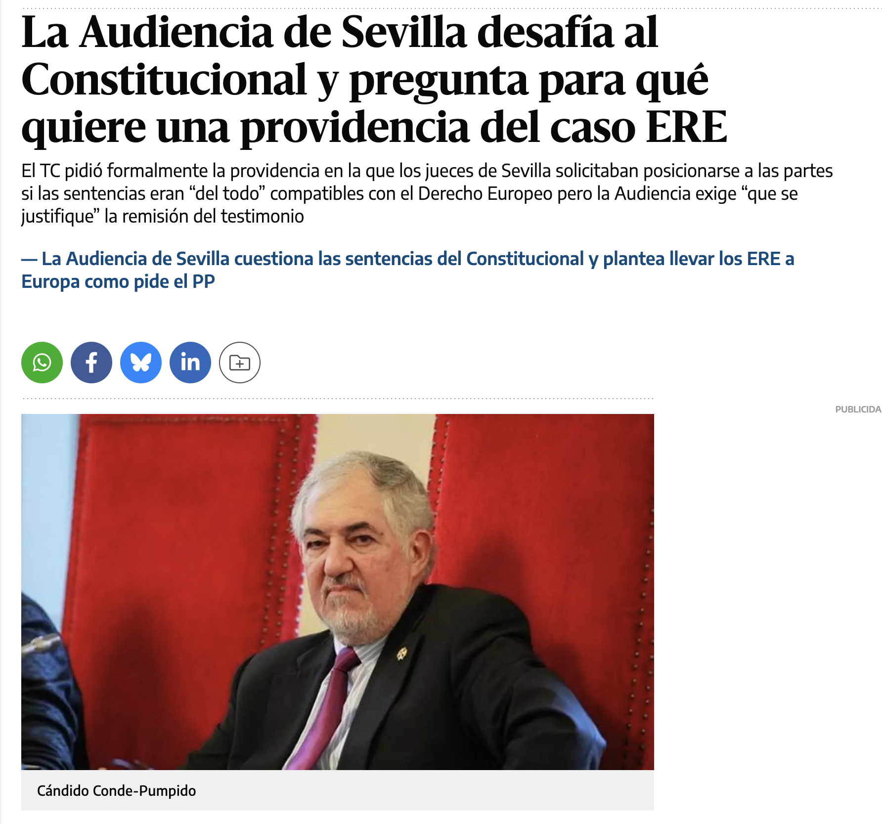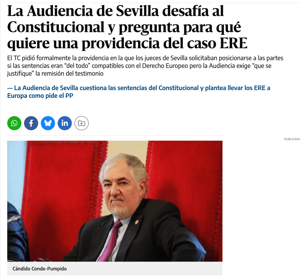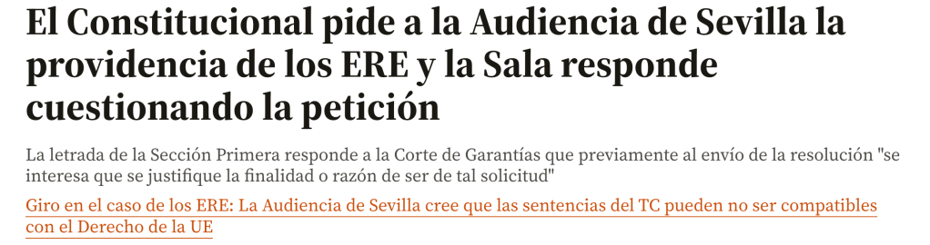 En el caso de la Audiencia de Sevilla, el origen del conflicto es la sentencia de 19 de noviembre de 2019 en la que fueron condenados por prevaricación y malversación varios implicados en el conocido como caso de los EREs. El Tribunal Supremo revisó la decisión, absolviendo parcialmente a algunos de los acusados o reduciendo las penas, pero mantuvo que los hechos, en su conjunto debían ser calificados como prevaricación y, en algunos casos, malversación. Los condenados presentaron recurso de amparo ante el Tribunal Constitucional, quien en una serie de sentencias (93/2024, 94/2024, 95/2024, 96/2024, 97/204, 98/2024, 99/2024, 100/2024, 102/2024 y 103/2024). Estas sentencias exculparon a quienes habían diseñado el sistema que permitió el desvío de fondos públicos ya que el TC entendía que no puede cometerse prevaricación en el marco del proceso legislativo y que tampoco existe malversación si hay una voluntad genérica de desvío de fondos, pero ésta voluntad no existe respecto a los casos específicos en que se producen las ayudas concretas. La STC 101/2024, sin embargo, negó el amparo a quien había ejecutado materialmente el desvío de fondos públicos, Juan Márquez Contreras, director general de trabajo de la Junta de Andalucía. Las sentencias del TC anulan las sentencias dictadas por la AP de Sevilla y el TS, por lo que el caso ha de volver a la Audiencia de Sevilla, que deberá dictar nueva sentencia teniendo en cuenta la doctrina constitucional. Esta AP, sin embargo, por providencia de 18 de marzo de 2025, concede un plazo de audiencia a las partes de diez días para que aleguen lo que estimen oportuno sobre el planteamiento de una cuestión prejudicial al Tribunal de Luxemburgo con el fin de determinar si la doctrina constitucional que han de aplicar es compatible con el derecho de la UE.