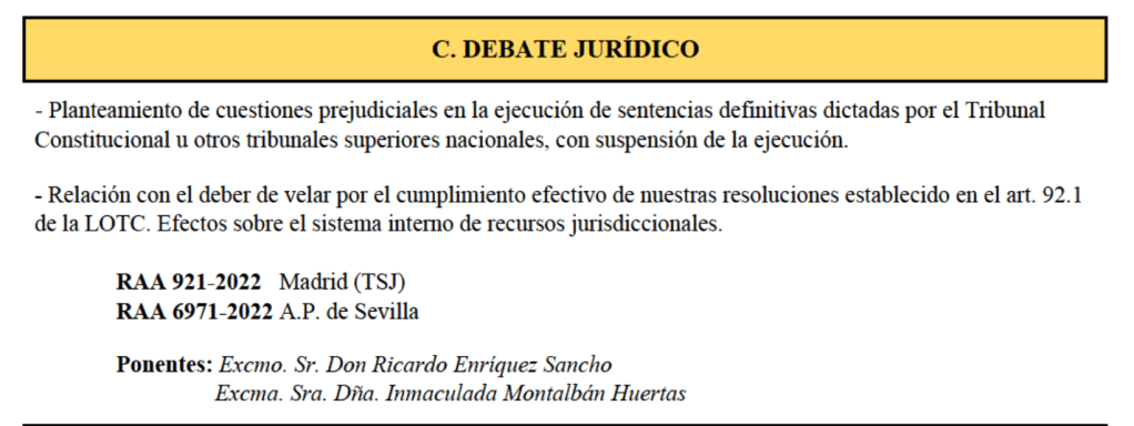 La referencia al art. 92.1 de la LOTC en el orden del día puede ser un recordatorio de la facultad que, como hemos visto, confiere ese precepto al Tribunal Constitucional para «declarar la nulidad de cualesquiera resoluciones que contravengan las dictadas en el ejercicio de su jurisdicción, con ocasión de la ejecución de éstas, previa audiencia del Ministerio Fical y del organo que las dictó». Entiendo, sin embargo, que en este caso, dado que el contenido de las sentencias del TC que se relacionan con el TSJ de Madrid y la AP de Sevilla no incluye más la anulación de las sentencias previas, pretender que el planteamiento de las cuestiones prejudiciales contraviene esas sentencias del TC sería claramente exorbitante. Ahora bien, también hay que recordar el art. 4.1 de la LOTC también prevé la declaración de nulidad de todas las resoluciones que menoscaben la jurisdicción o competencia del Tribunal Constitucional. En una interpretación estricta, este precepto habilitaría para declarar la nulidad de las decisiones que se pronuncian sobre cuestiones que son competencia del Tribunal Constitucional; pero en una más amplia podría cubrir todas aquellas resoluciones que no respetan -de acuerdo con el criterio del TC- la especial posición que este órgano jurisdiccional tiene en el ordenamiento. Sea como fuere, la posibilidad de alguna actuación respecto a las decisiones adoptadas por la AP de Sevilla y el TSJ de Madrid no puede descartarse.