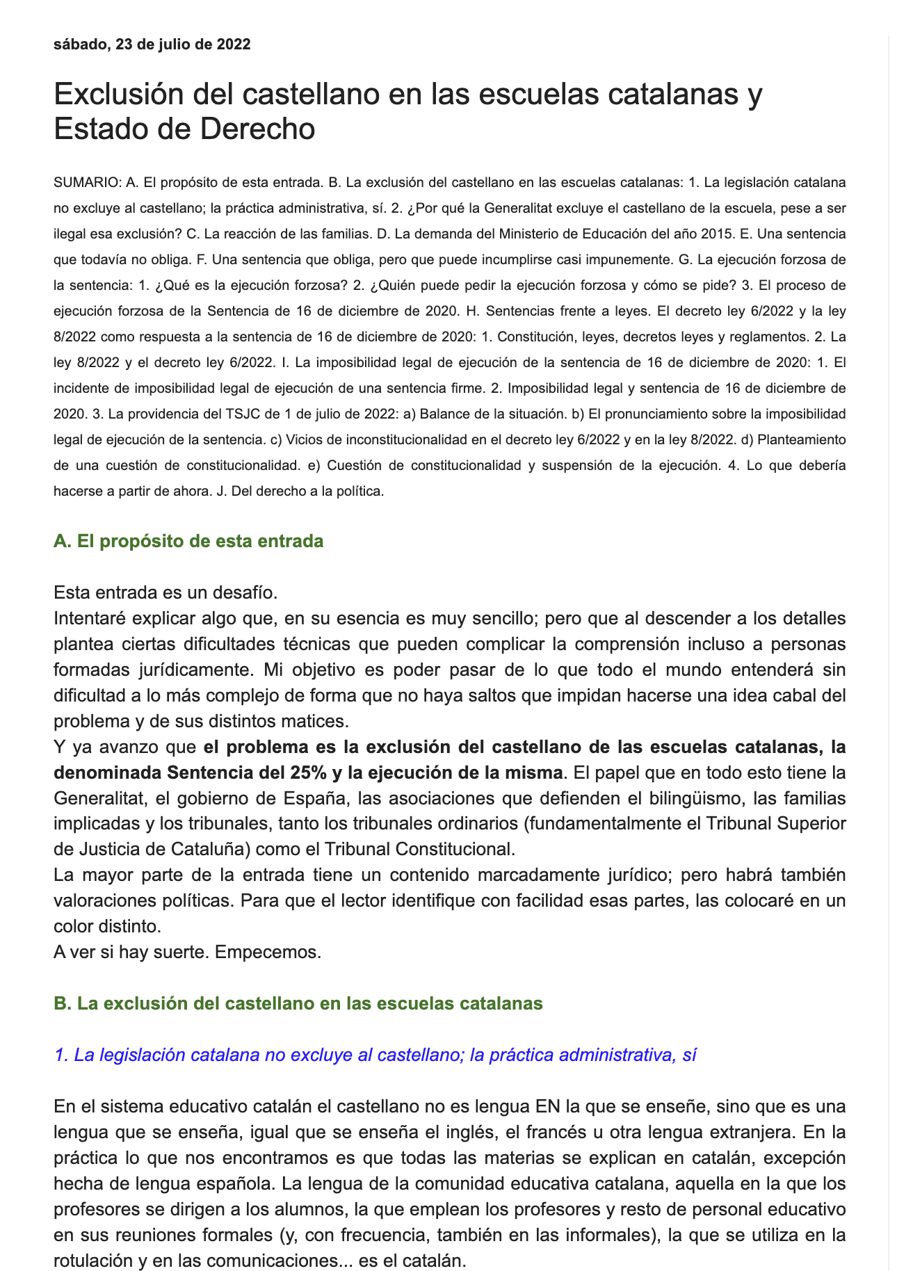 La exclusión del castellano se produce pese a que la Constitución española reconoce la oficialidad de esta lengua, de lo que se deriva, por una parte, el derecho a recibir enseñanza en español y, por otra parte, la imposibilidad de que la administración dote de preferencia al catalán por ser la lengua propia de Cataluña. Me he ocupado con más detalle de este tema en otras entradas, entre ellas, «Exclusión del castellano en las escuelas catalanas y Estado de Derecho«.