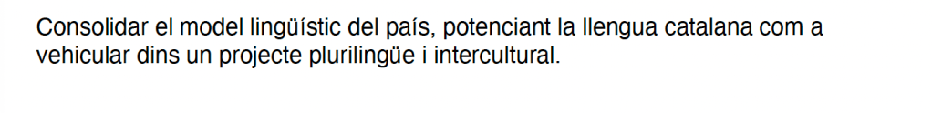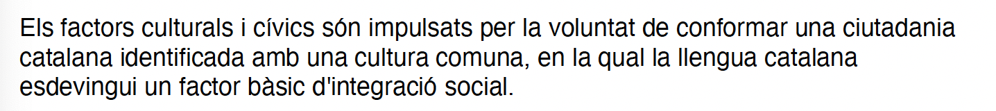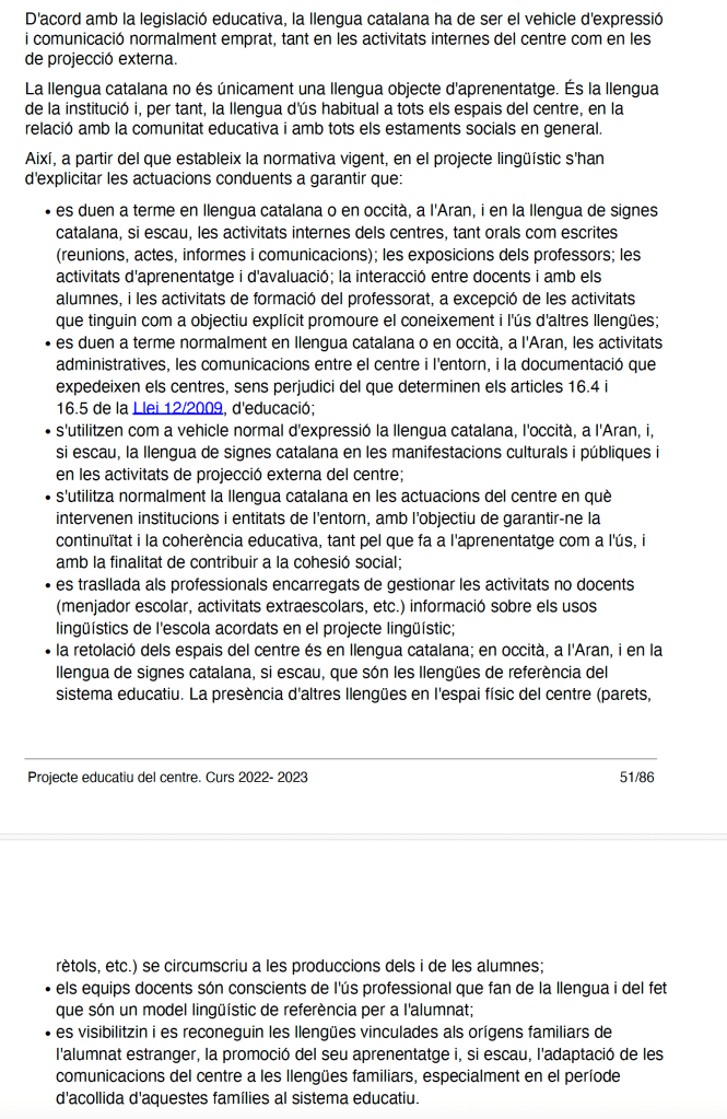 En definitiva, la escuela al servicio de un proyecto de construcción nacional que toma como base la lengua catalana, y todo ello en flagrante contradicción con las exigencias derivadas de la oficialidad del castellano, que implican la necesidad de que la administración en general y la escuela en particular utilicen el español con normalidad y que sea, junto con el catalán, lengua vehicular del sistema educativo.