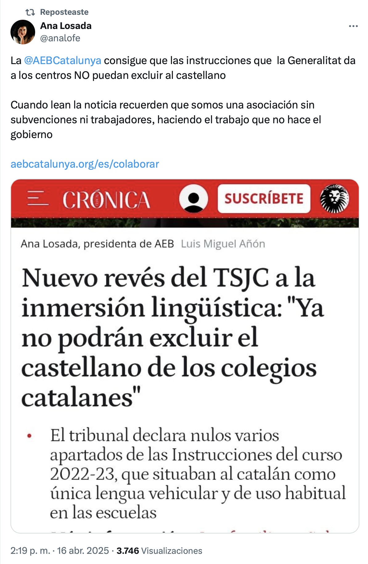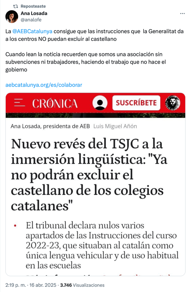 Sería exigible que el Gobierno de España se opusiera a esta exclusión del español, lengua común, oficial en el conjunto de España y materna de la mayoría de los catalanes, pero, como se ha adelantado, el partido socialista participa plenamente del proyecto nacionalista, así que no solamente se abstiene de ejercer las competencias que tiene para garantizar los derechos lingüísticos de todos los españoles, sino que apoya esta exclusión. Es por esto que ha de ser la sociedad civil la que realice una función que debería ser de las instituciones de todos. En este caso, la Asamblea por una Escuela Bilingüe de Cataluña (AEB), entidad impulsada por José Domingo y presidida por Ana Losada.
