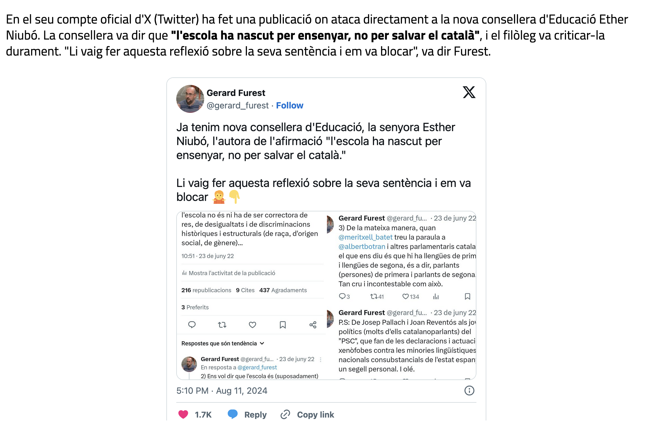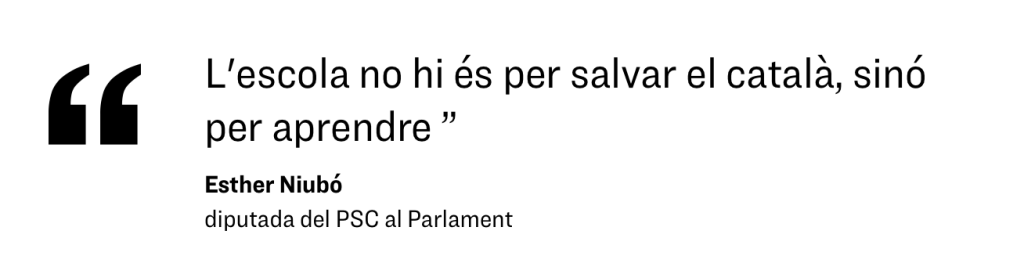 Lamentablemente, dudo que la Consejera de Educación, Esther Niubó, haga lo que sería normal en un país democrático, porque, como ya he avanzado, la posición de nacionalistas y socialistas, de socialistas y nacionalistas es la misma: supeditación de los derechos individuales a la construcción nacional catalana, utilización de la escuelas para un fin político y preferencia de los objetivos políticos nacionalistas sobre las consideraciones pedagógicas.