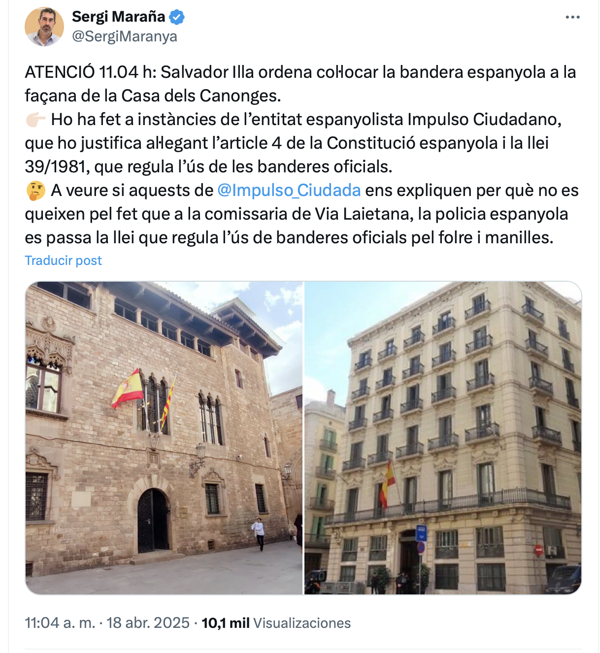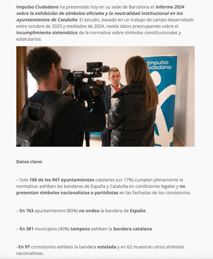 Haríamos bien en dar importancia a los símbolos porque, como digo, la tienen, y en Cataluña son utilizados de manera constante por el nacionalismo para profundizar en la separación entre los catalanes y el resto de los españoles. Estoy orgulloso de formar parte de Impulso Ciudadano, una asociación que trabaja, entre otros ámbitos, también en la defensa del cumplimiento de la legalidad en materia de símbolos; un cumplimiento que es, además, garantía del respeto a los derechos fundamentales de los ciudadanos.