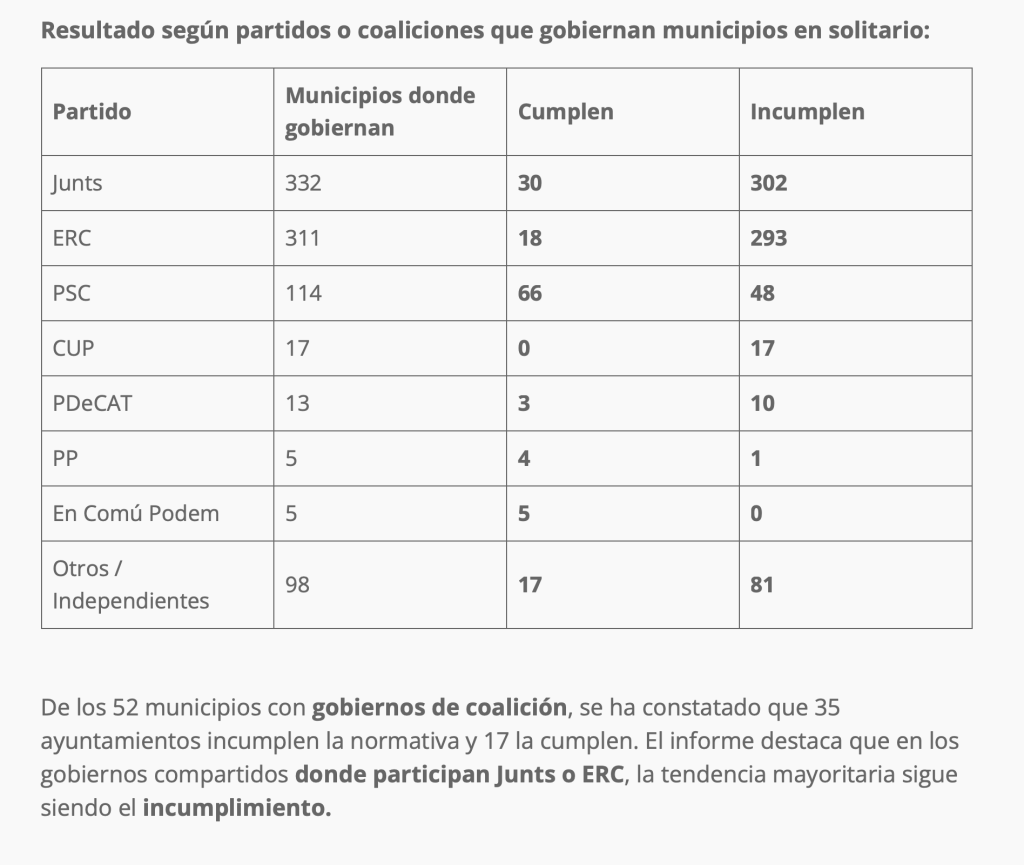 En el caso de Junts, el 90% de los ayuntamientos que gobiernan incumplen. El porcentaje de incumplimiento, en el caso de ERC, es del 94%. La CUP incumple en el 100% de los ayuntamientos que gobierna, PDCAT incumple en el 76% de sus ayuntamientos. El PSC incumple en el 42% de los ayuntamientos que gobierna mientras que el PP incumple en el 20% de sus ayuntamientos (1 sobre 5). El único grupo en el que el cumplimiento es del 100% es «En Comú Podem», puesto que la normativa se cumple en los 5 ayuntamientos que gobierna (entre ellos, el mío, el de Santa Perpètua de Mogoda).