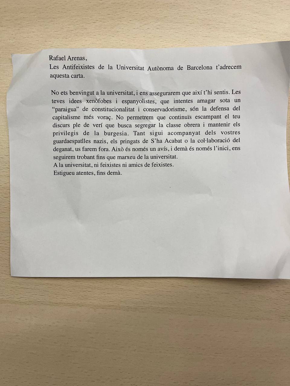 La víspera del acto, estaba trabajando en mi despacho de la Facultad cuando alguien introdujo por debajo de la puerta un mensaje amenazante en relación a mi participación en dicho acto. Este el mensaje: