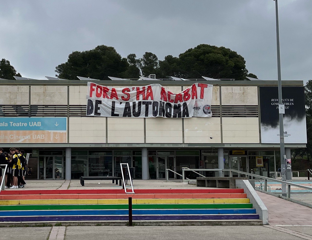¿Cómo es posible que habiendo recibido profesores de la UAB amenazas de alguien que se identifica como «Antifeixistes» en relación a un acto de S’ha Acabat! se permita en una de las paredes de la Universidad esta pancarta