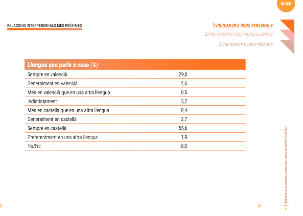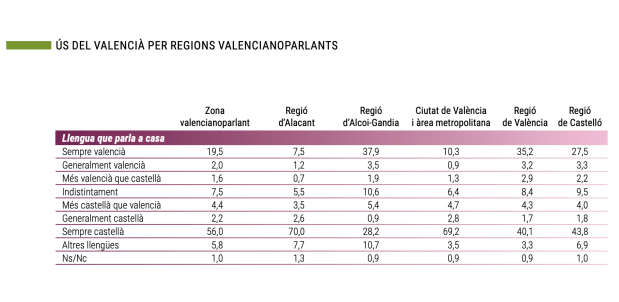 En cualquier caso, incluso en las zonas valencianoparlantes, el castellano es mayoritario; siendo más de un 62% de la población en esas zonas que utiliza en su casa únicamente castellano o más castellano que valenciano. El porcentaje de la población que utiliza única o mayoritariamente valenciano es de un 23,1%