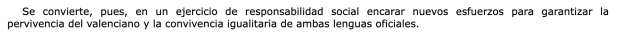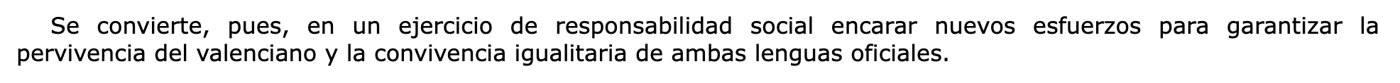 Podría entrarse en si resulta legítimo que una administración pública indique cuál es la lengua «correcta» que ha de ser utilizada, o cual es la proporción adecuada en el uso particular de una u otra lengua; pero no entraré en ello porque aquí me interesa centrarme en el hecho de que la escuela es considerada abiertamente como una herramienta para la recuperación del valenciano y la modificación de los usos lingüísticos de la población. Esto es, el incremento de la presencia del valenciano responde no a un fin pedagógico, sino político. Un fin con el que se podrá estar o no de acuerdo, pero que no es la mejor formación de los alumnos; sino que éstos sean partícipes de un proyecto colectivo: la consecución de lo que se denomina «plena igualdad lingüística» que ahora, de acuerdo con las cifras existentes sobre uso de valenciano y castellano, no ha sido aún lograda.