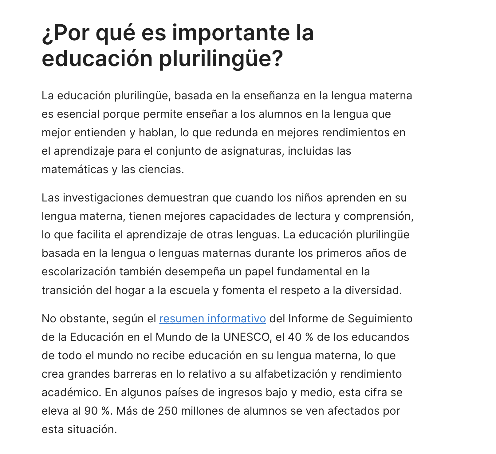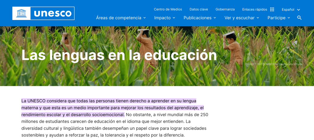 Sobre la importancia de la lengua materna en la educación, no hace falta añadir mucho a lo que dice la UNESCO, que destaca la importancia de que el primer aprendizaje se haga en la lengua materna, que la lectoescritura se adquiera en la lengua materna y que esté presente en la formación de los estudiantes; introduciendo progresivamente otras lenguas; otras lenguas que serán mejor aprendidas cuanto más asentada esté la lengua materna.