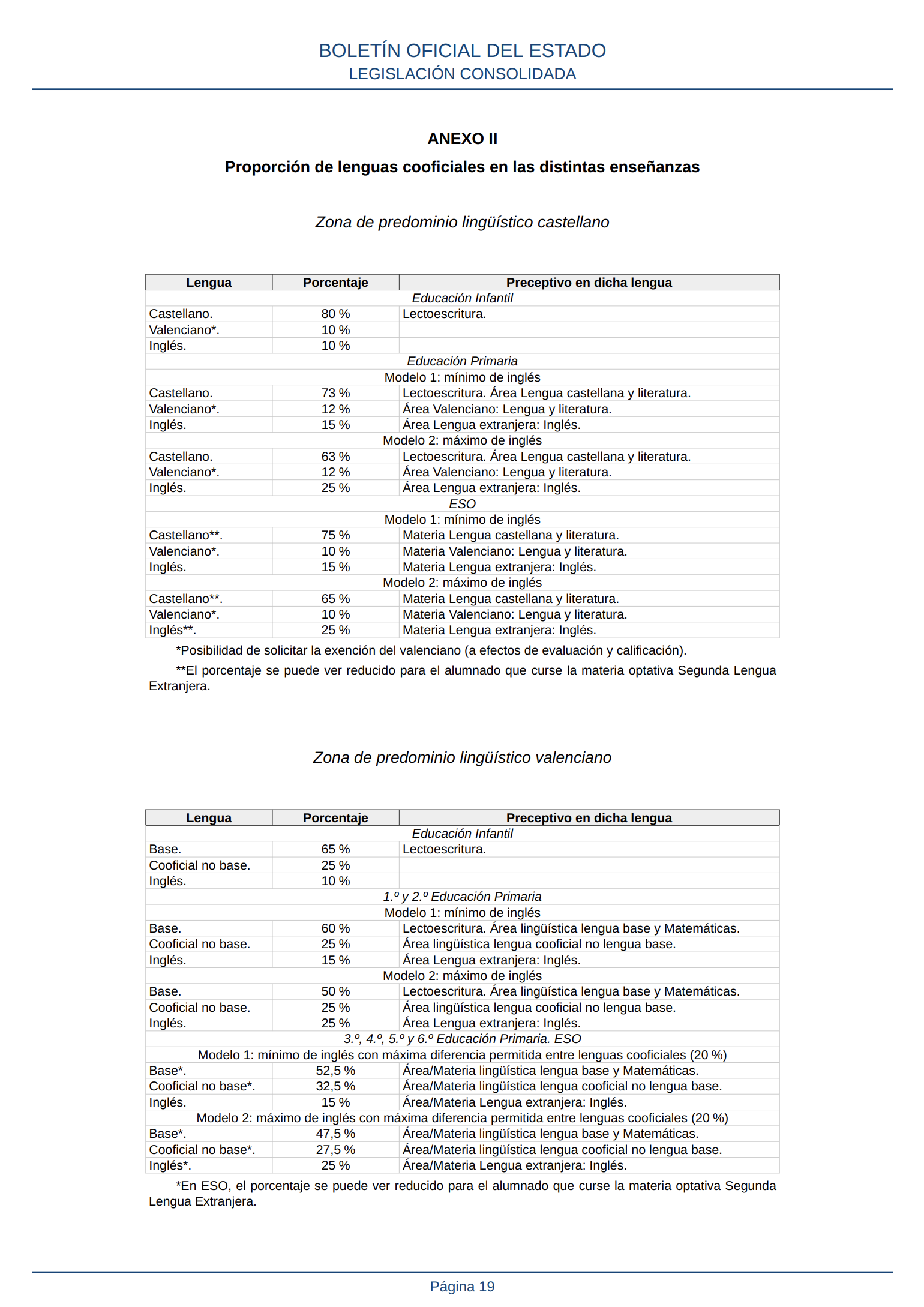 Esta ley parte, en las zonas valencianoparlantes de la CV, de la convivencia de la que se denomina «lengua de base» en cada unidad educativa y la otra lengua cooficial. En educación infantil, la lengua de base tendrá una presencia del 65% y la otra lengua oficial, del 25%. Le lectoescritura se hará en la lengua de base. En la educación primaria, se garantiza una presencia mínima de un 25% de la lengua cooficial que no sea de base en los dos primeros cursos de educación primaria. A partir de tercero, la lengua de base tendrá una presencia mayor que la otra lengua cooficial, pero esa diferencia no podrá superar el 20% Este modelo equilibrado se mantiene también en la ESO (véase, en ese sentido, el anexo II de la ley).