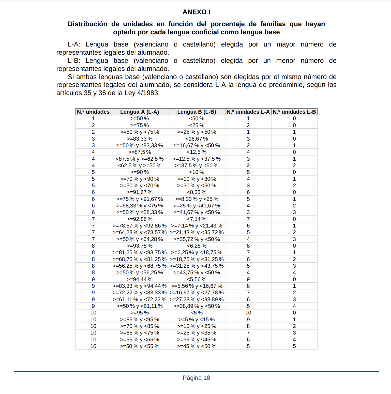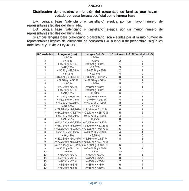 Es decir, la ley no hace más que garantizar la presencia en la enseñanza, como vehiculares, de las dos lenguas oficiales y prever que la lectoescritura se haga en la lengua de base elegida. Esta lengua de base es elegida por los representantes legales de los alumnos; pero no otorga directamente un derecho a ser escolarizado en un sistema que tenga como parte nuclear la lengua elegida (entendida «parte nuclear» en los términos que se acaban de explicar: mayor presencia de dicha lengua y aprendizaje de la lectura y de la escritura en ella); sino que en cada centro se atenderá a las peticiones de las familias de acuerdo con los resultados obtenidos. Así, por ejemplo, si en un centro con tres líneas un 55% de las familias optan por el castellano y un 45% por el valenciano, ese centro tendrá dos líneas con el castellano como lengua de base y una con el valenciano como lengua de base.