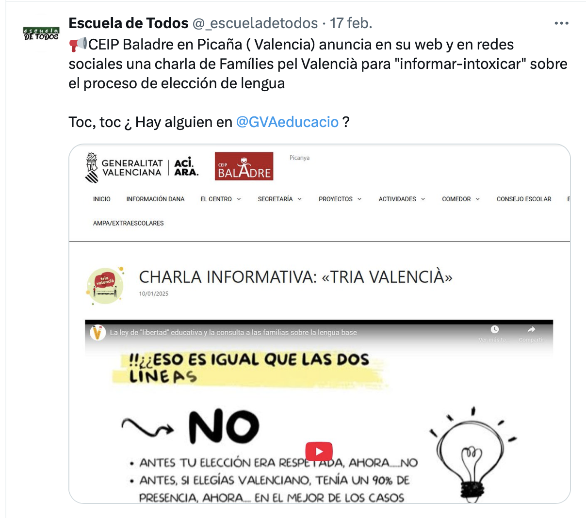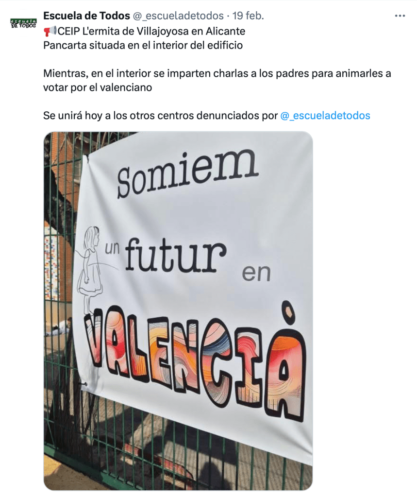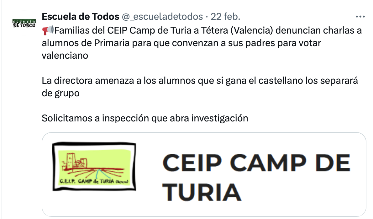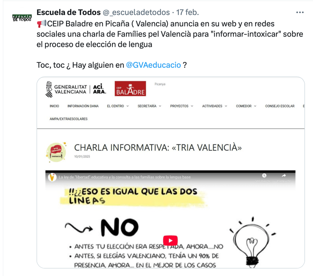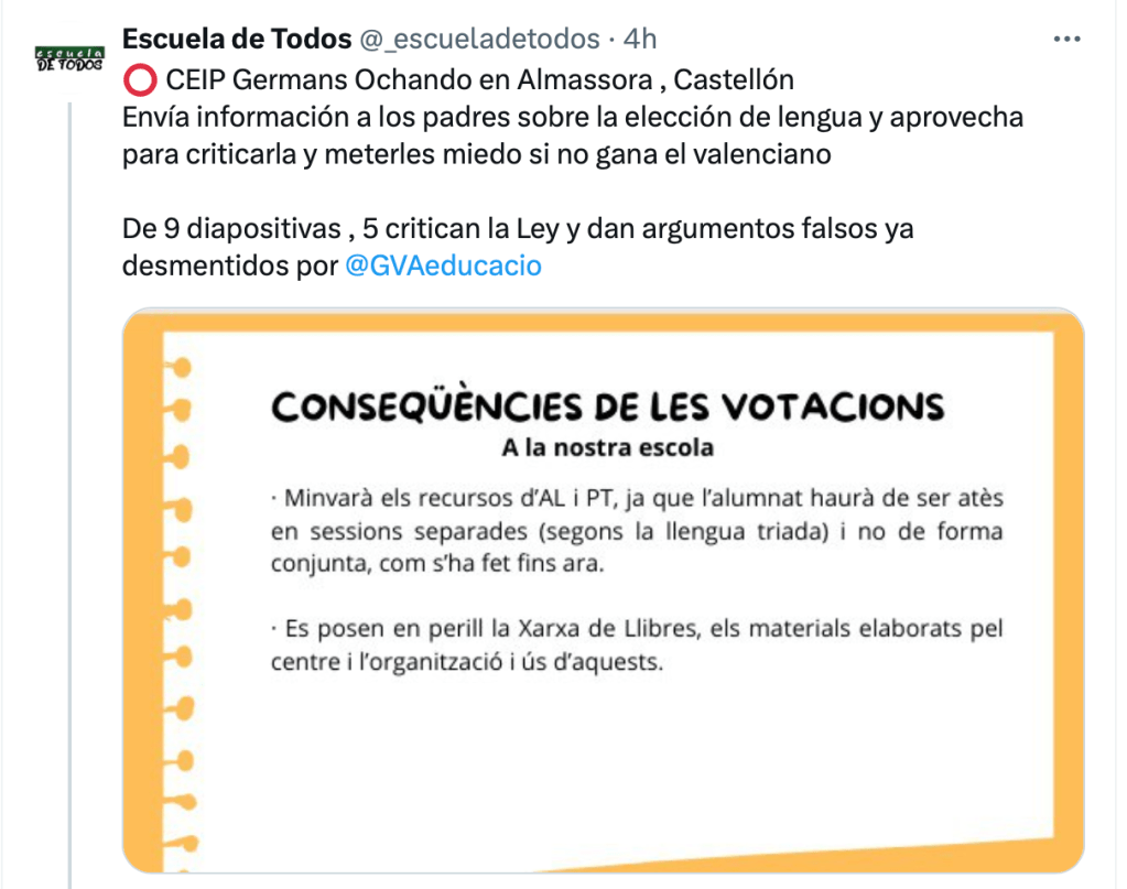 Muchísimo menos, cuando esa opción no es de una asociación u organización de la sociedad civil, sino del propio centro público, que debería guardar una exquisita neutralidad en beneficio, precisamente, de la libertad de las familias. En las últimas semanas, sin embargo, son varios los centros educativos de la CV que se han dirigido a las familias para cuestionar la ley de libertad educativa y recomendar la elección del valenciano.