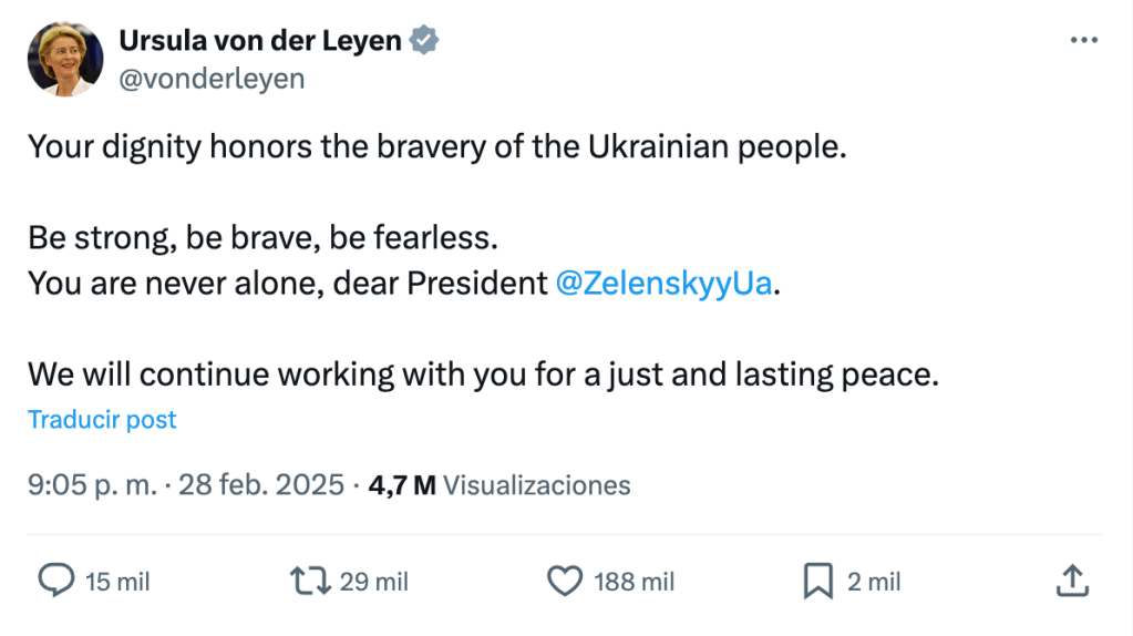 Es evidente que erraron en sus cálculos. Me parece sorprendente que pensaran que Zelenski no iba a replicar las cosas que allí se estaban diciendo. Zelenski no tiene el poder de Trump, pero sigue siendo jefe de estado, ha dirigido a su país durante tres años en una guerra y su valor está contrastado. Todos recordamos su rostro moviéndose por Kiev los primeros días de la guerra para evitar ser capturado por los cuerpos de operaciones especiales rusos, y la forma en que rechazó un vuelo para huir de Kiev cuando los tanques rusos estaban a 20 kilómetros de la capital. Dudo que a alguien que tiene esas experiencias le impresione el Despacho Oval.