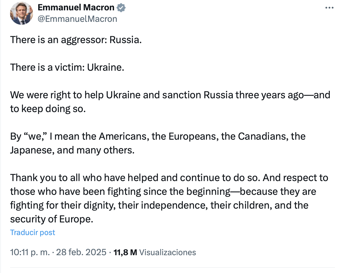 Así pues, tras el 28 de febrero, o bien Ucrania se queda sola frente a Rusia, lo que podría llevar a una victoria definitiva rusa en el corto plazo (lo que no beneficiaría a Estados Unidos, imagino) o bien conduciría a una reacción europea que pondría más medios, haría crecer su industria de defensa y se alejaría de Estados Unidos, lo que no sé si conviene a Estados Unidos.