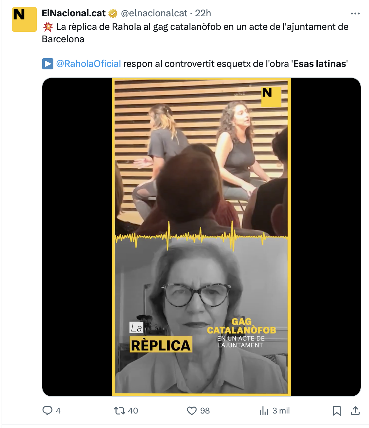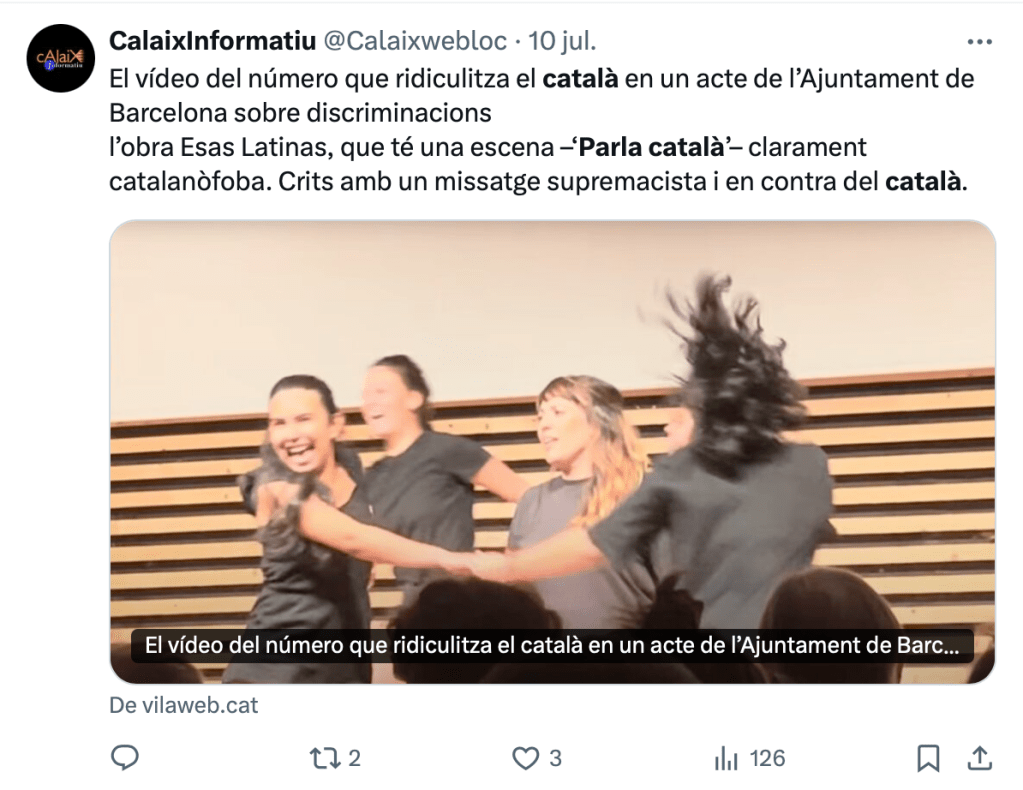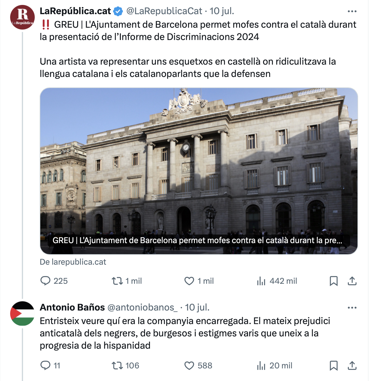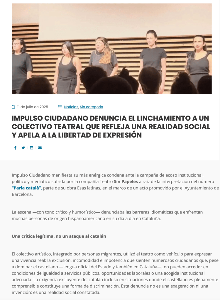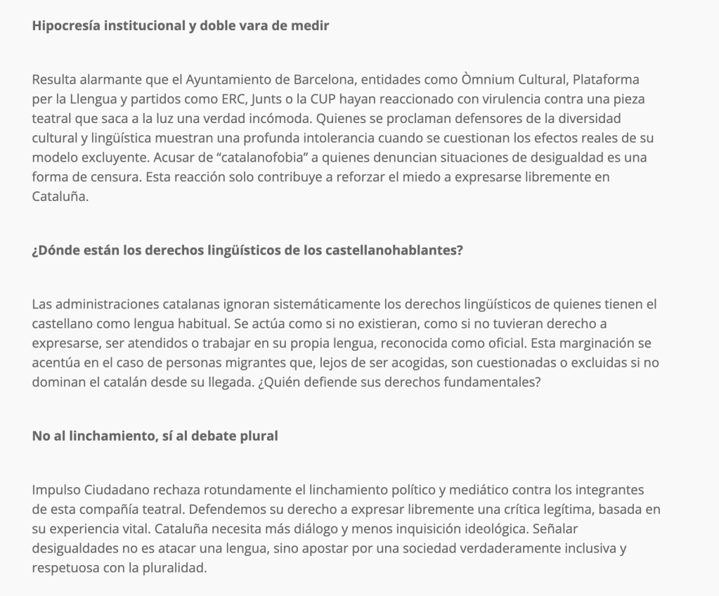 Por supuesto, lo anterior no quita que existen personas que no han podido ser atendidas en catalán pese a haber querido recibir explicaciones en esa lengua; pero el que se den estos casos no supone que lo que cuenta la obra no sea cierto. En cualquier caso, no quiero extenderme más en ello, porque lo que me parece más relevante es la reacción nacionalista a la obra de teatro. Tal y como se ha indicado, desde el nacionalismo se ha tildado la obra de catalanófoba, se han pedido explicaciones al ayuntamiento y se ha iniciado un linchamiento en redes sociales que denunciaba hace unos días Impulso Ciudadano.