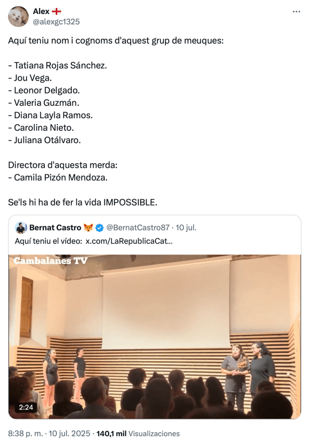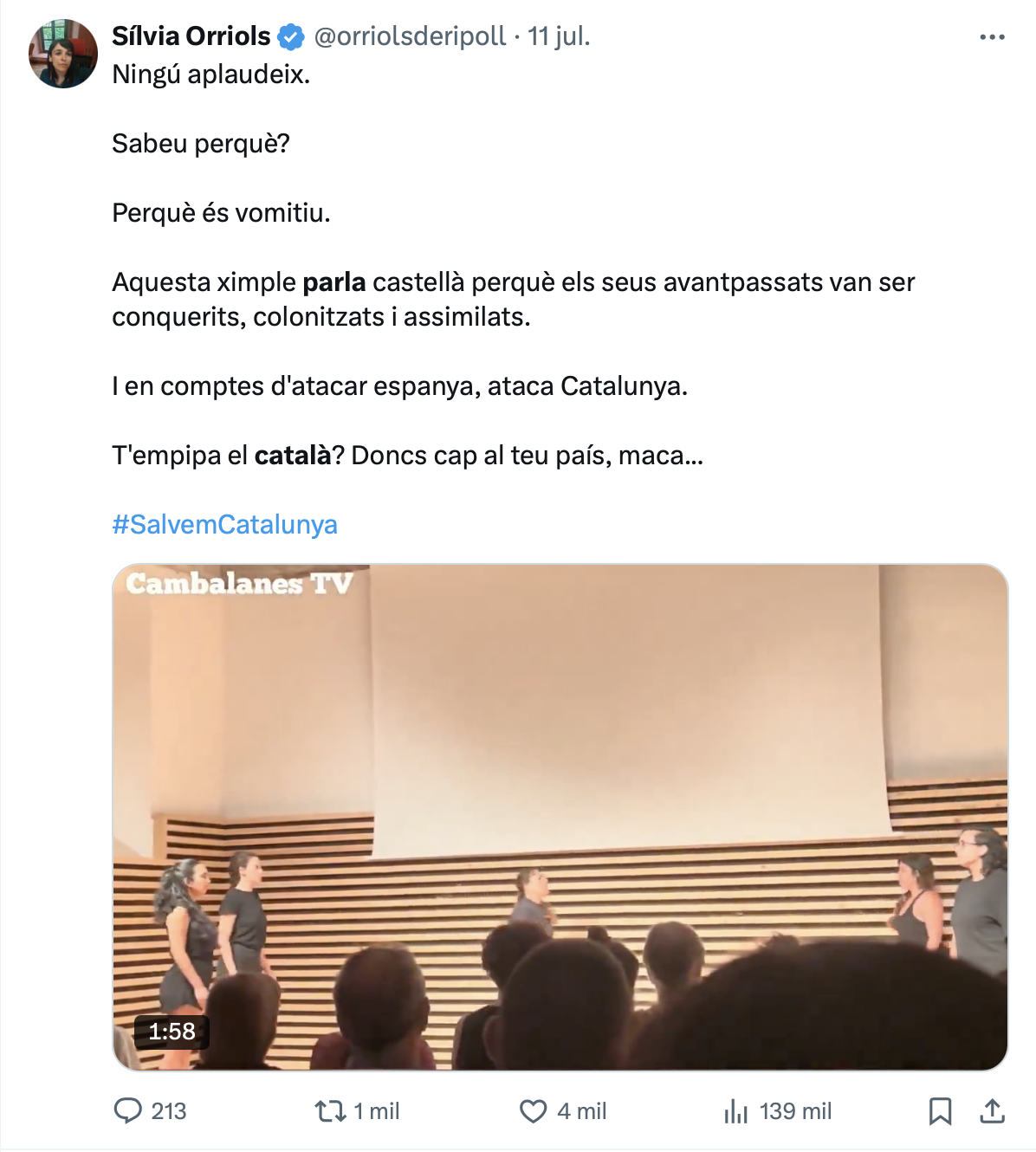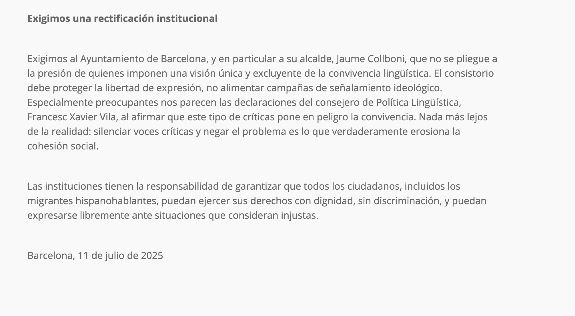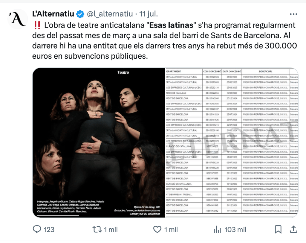 Por supuesto, lo anterior no quita que existen personas que no han podido ser atendidas en catalán pese a haber querido recibir explicaciones en esa lengua; pero el que se den estos casos no supone que lo que cuenta la obra no sea cierto. En cualquier caso, no quiero extenderme más en ello, porque lo que me parece más relevante es la reacción nacionalista a la obra de teatro. Tal y como se ha indicado, desde el nacionalismo se ha tildado la obra de catalanófoba, se han pedido explicaciones al ayuntamiento y se ha iniciado un linchamiento en redes sociales que denunciaba hace unos días Impulso Ciudadano.