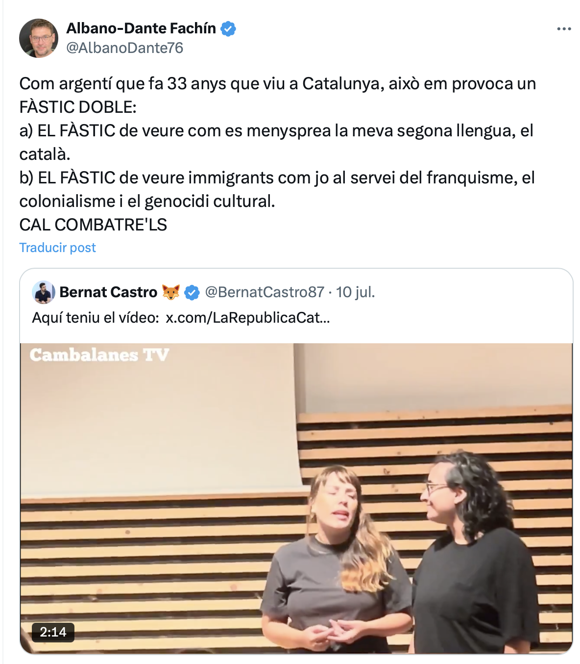 • ¿Acabarían algunos cayendo en la cuenta de que de ninguna forma está justificada la subordinación actual del castellano frente al catalán, una subordinación que no solo es de lenguas, sino también de hablantes, porque, como dicen los informes internacionales, la discriminación de las lenguas acaba siendo también discriminación de las personas?