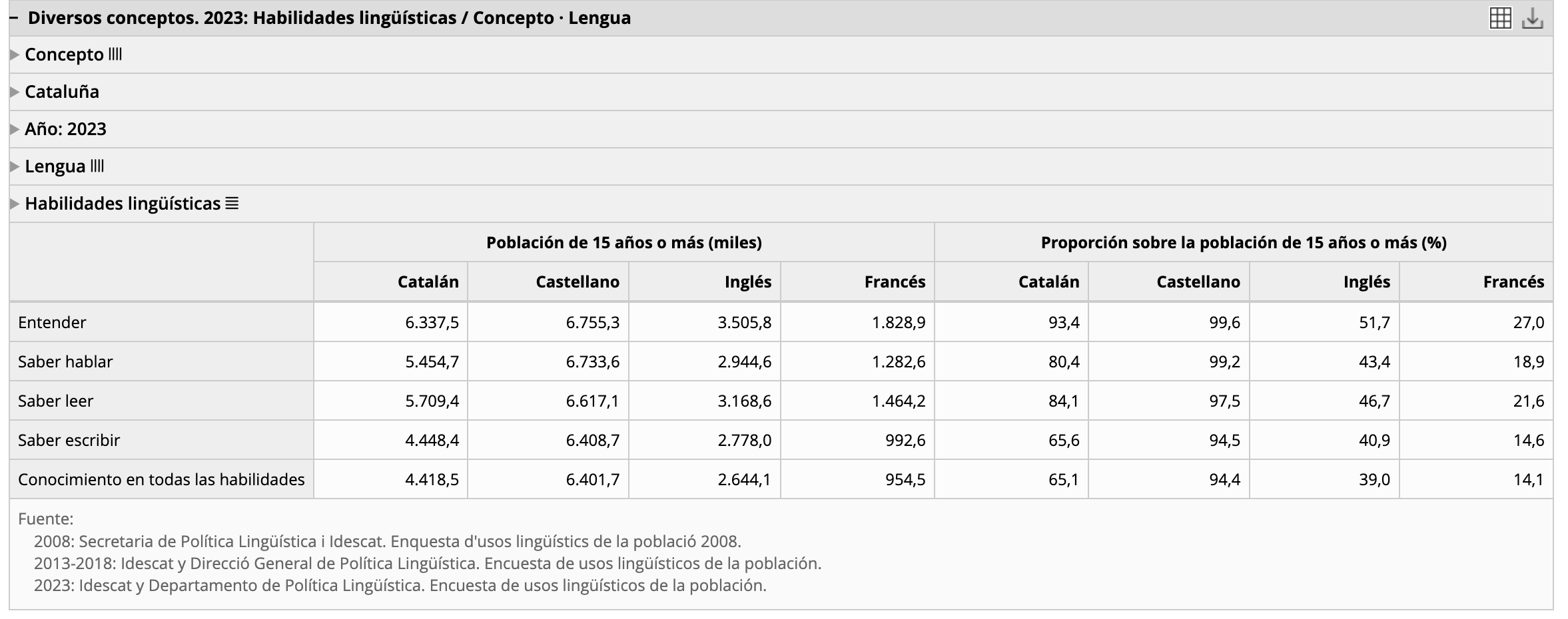 Cataluña es una Comunidad Autónoma en la que la mayoría de la población (un 54%) tiene como lengua materna el castellano, mientras que aproximadamente un 35% de los catalanes tienen el catalán como lengua materna. A partir de aquí, como es lógico, catalán y castellano son utilizados de manera generalizada en las relaciones familiares y sociales. Según datos del IDESCAT, un 32,6% de los catalanes tienen como única lengua habitual el catalán, un 46,5% de los catalanes tienen como única lengua habitual el castellano, mientras que un 9,4% de los catalanes declara que sus lenguas habituales son tanto el catalán como el castellano.