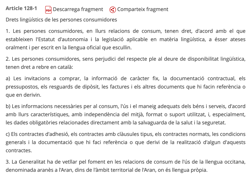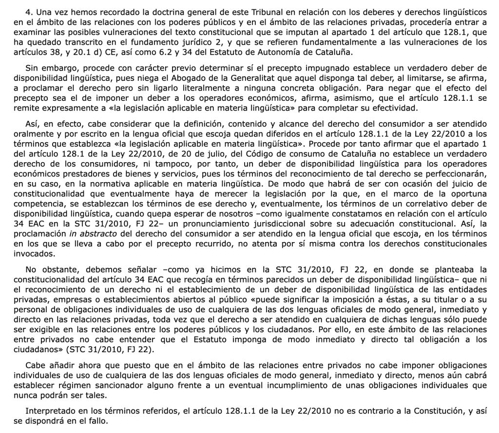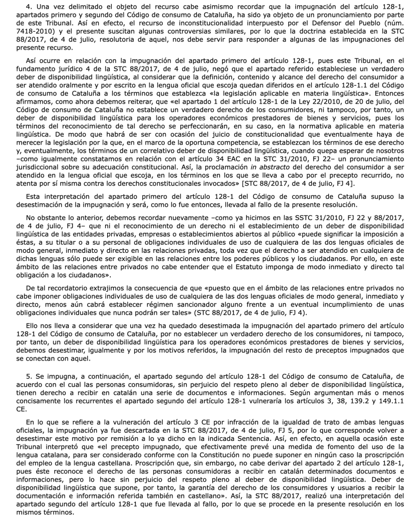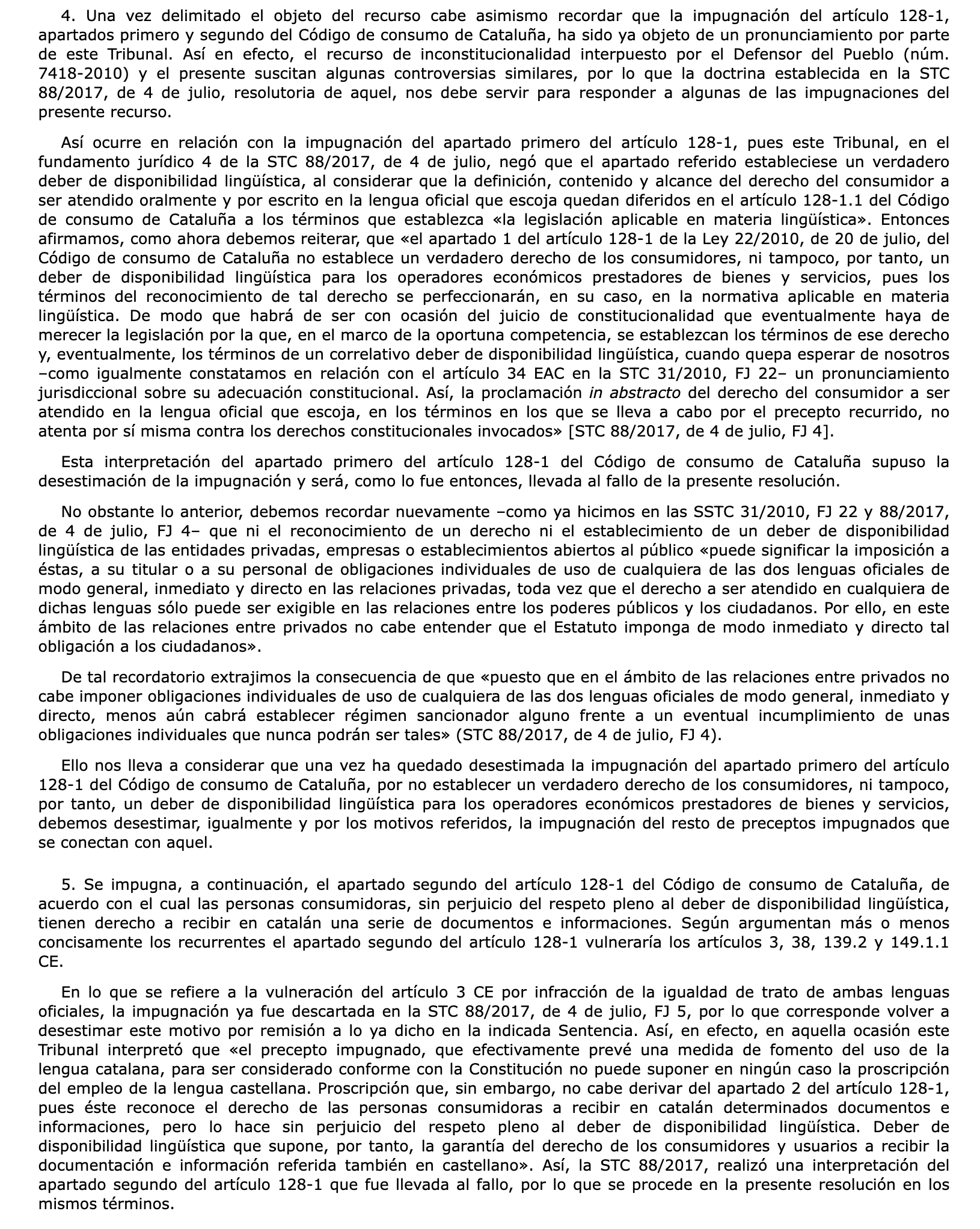 También es necesario señalar -aunque aquí no profundizaremos en ello- que el Tribunal Constitucional, en sus sentencias 88/2017, de 4 de julio y 7/2018, de 25 de enero determinó la interpretación constitucionalmente conforme de este art. 128.1 del Código de Consumo de Cataluña; interpretación que subraya la imposibilidad de establecer obligaciones directas en relación al uso de las lenguas entre particulares.