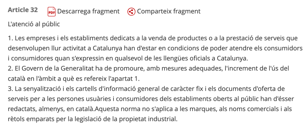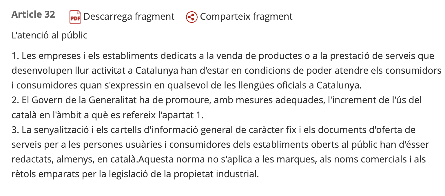 Además, el art. 32 de la Ley de Política Lingüística de Cataluña (Ley catalana 1/1998 de 7 de enero) prevé que las señales y carteles fijos han de estar redactados al menos en catalán. También recoge este artículo la obligación de las empresas y establecimientos dedicados a la venta de productos o a la prestación de servicios en Cataluña de estar en condiciones de atender a los consumidores en cualquiera de las lenguas oficiales de Cataluña.