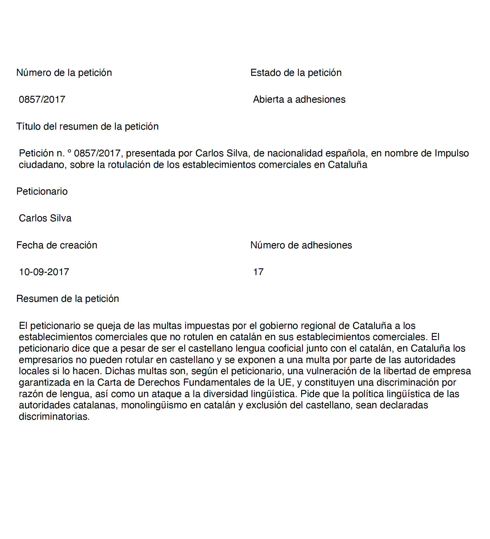 No entraremos en la interpretación constitucional de estas normas; sino que nos centraremos en su compatibilidad con el derecho de la UE. En 2017, Impulso Ciudadano dirigió una petición a la Comisión competente del Parlamento Europeo en la que ponía de manifiesto que las multas impuestas a los empresarios que no rotulaban en catalán sus establecimientos eran una limitación a la libertad de empresa garantizada en la Carta de Derechos Fundamentales de la UE, constituyen una discriminación por razón de lengua y un ataque a la diversidad lingüística.