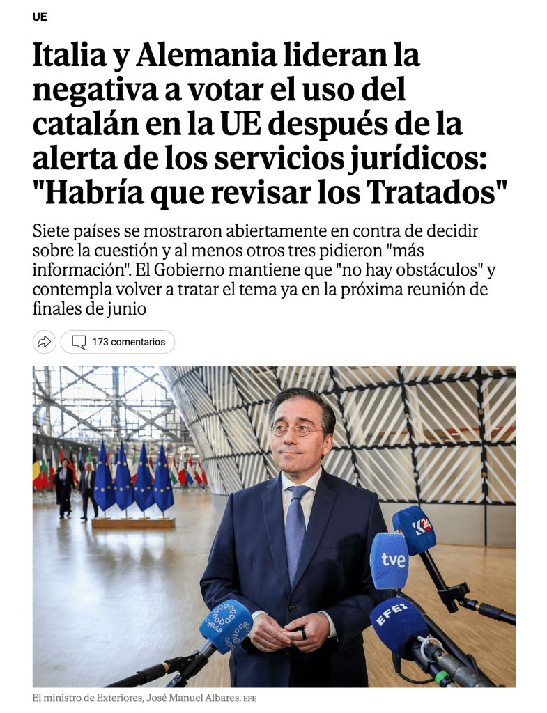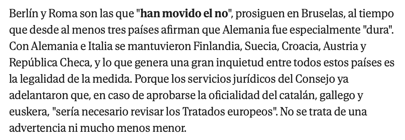 En este contexto, ¿qué sentido tiene la oficialidad del catalán y las que de él se derivan (gallego y vasco, porque, no conviene olvidar que la petición española nace de la exigencia de Junts para la investidura de Sánchez)? Obviamente, solo se entiende desde un planteamiento nacionalista que utiliza la lengua como elemento de identificación. Los derechos lingüísticos de los ciudadanos catalanes a nivel europeo ya están perfectamente reconocidos por dos vías diferentes: