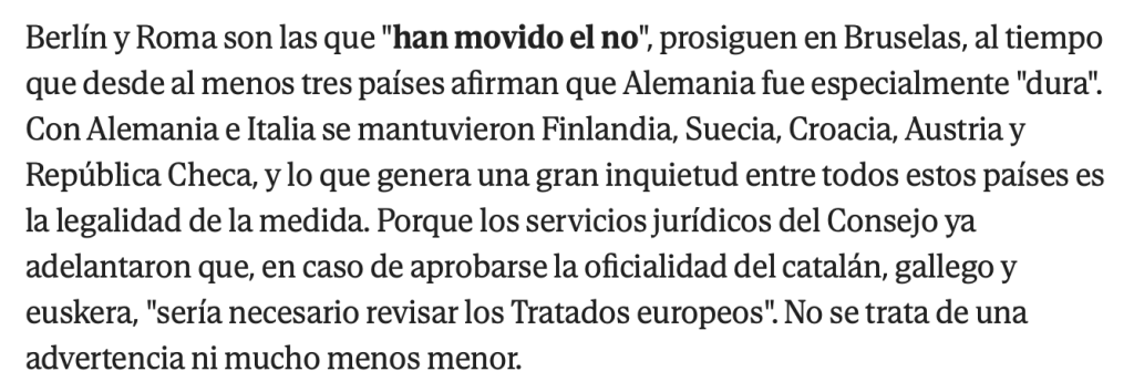 Dos días después del taller en la Comisión de Peticiones del Parlamento del que me ocupaba en el epígrafe anterior, tuvo lugar ua sesión del Consejo de Asuntos Generales de la UE que volvió a rechazar la modificación del Reglamento de Régimen Lingüístico para incluir como lenguas oficiales de la UE el catalán, el euskera y el gallego.