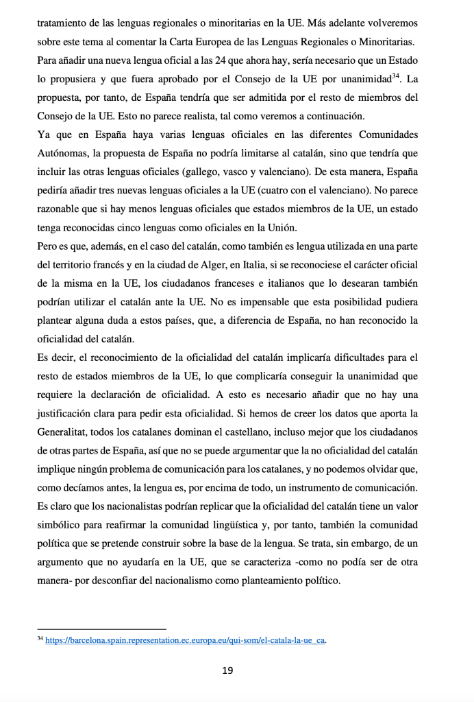 Desde mi perspectiva, poco favor se hace a la lengua catalana vinculándola a un proyecto político como el nacionalismo. Creo que le iría mejor con un planteamiento abierto centrado en los derechos lingüísticos de sus hablantes y en la búsqueda de soluciones realistas. Por ejemplo, en el documento de Impulso Ciudadano se apuntaba que, en vez de buscar una imposible oficialidad del catalán en la UE, podría explorarse la reforma de algunos textos legales de la UE que se refieren a «lenguas oficiales de la UE» y sustituir esa expresión por la de «lenguas oficiales en la UE» o «en algún territorio de la UE»; puesto que esto abriría puertas para una consideración del catalán (y otras lenguas regionales) que ahora están cerradas. Pero, claro, esta propuesta se hace desde el pragmatismo y con el objetivo de potenciar los derechos lingüísticos de las personas; una perspectiva que rechazan quienes se centran en los derechos de las lenguas, entendidos como un sucedáneo de los derechos de las naciones o de los pueblos.