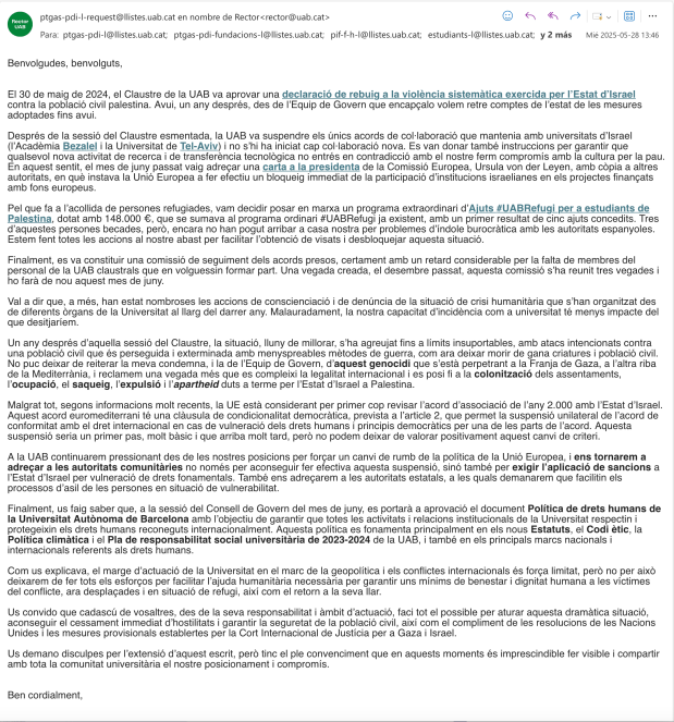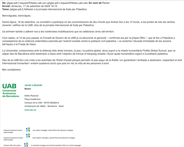 Una insistencia en la utilización del término «genocidio» que ha penetrado en muchas instituciones. Así, por ejemplo, hace unos días, en mi universidad, la Universidad Autónoma de Barcelona, recibía el siguiente correo electrónico colectivo de nuestro Rector: