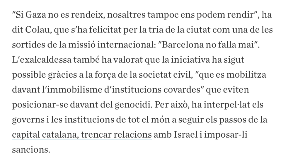 El discurso de los dos bandos y que hay que estar con uno de ellos. Es significativo que en el momento de la salida de la flotilla Ada Colau dijera que si Gaza no se rinde, ellos tampoco se podían rendir.