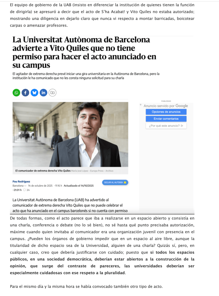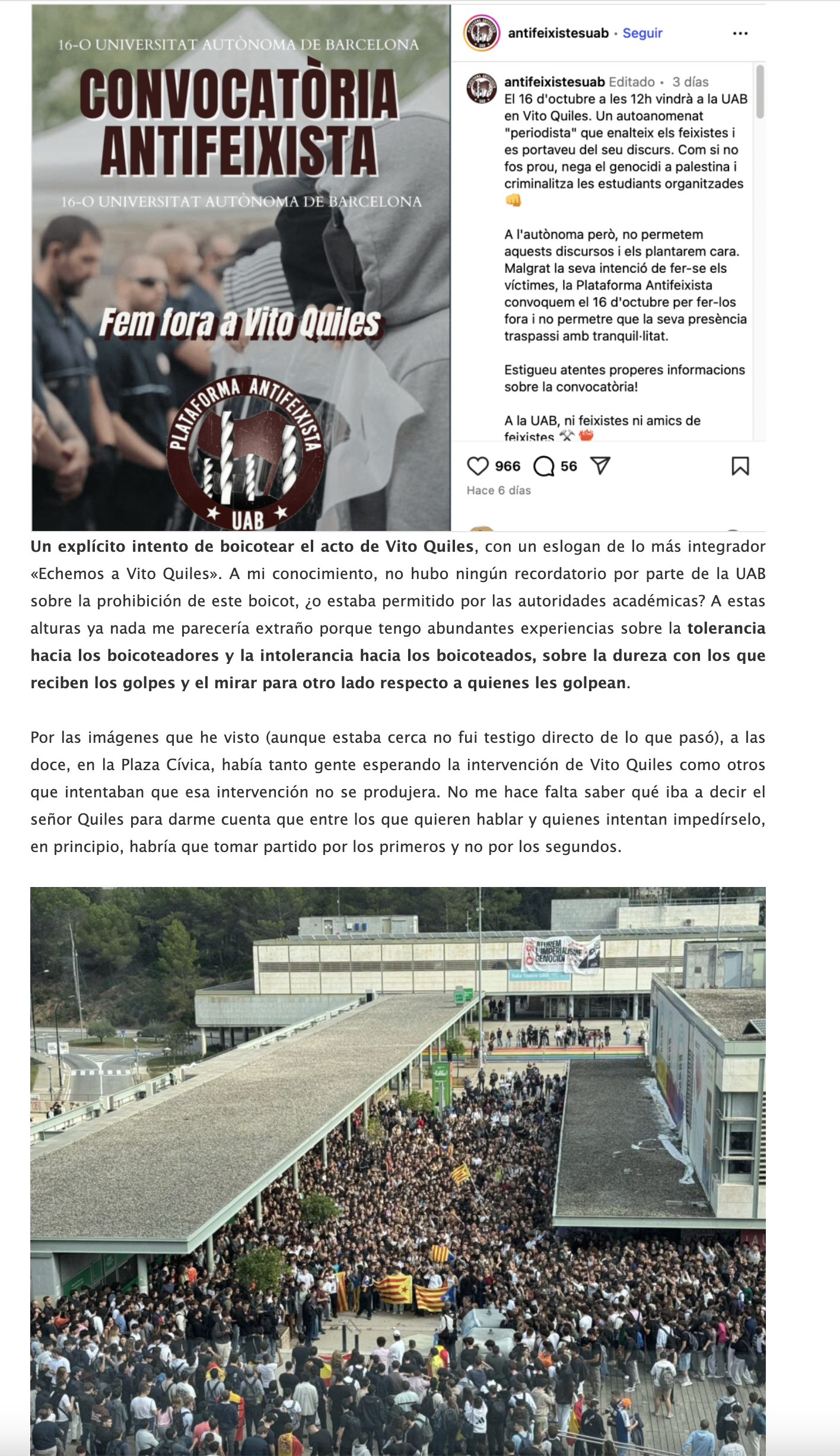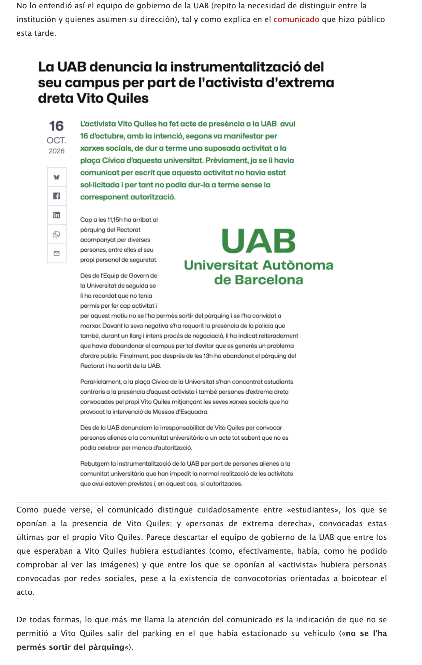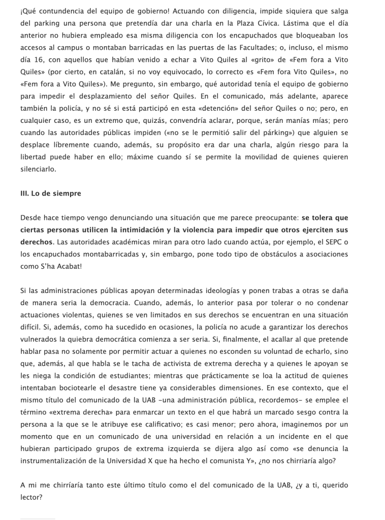Vito Quiles, un «comunicador» (como se dice ahora) había anunciado una gira por varias Universidades españolas. El primer acto iba a tener lugar en mi propia Universidad (la UAB) y fui testigo bastante directo de lo que pasó (lo comentaba en la segunda parte de esta entrada de hace unos días).