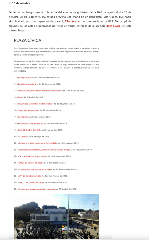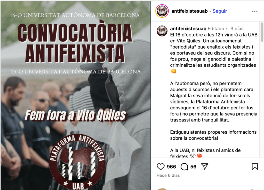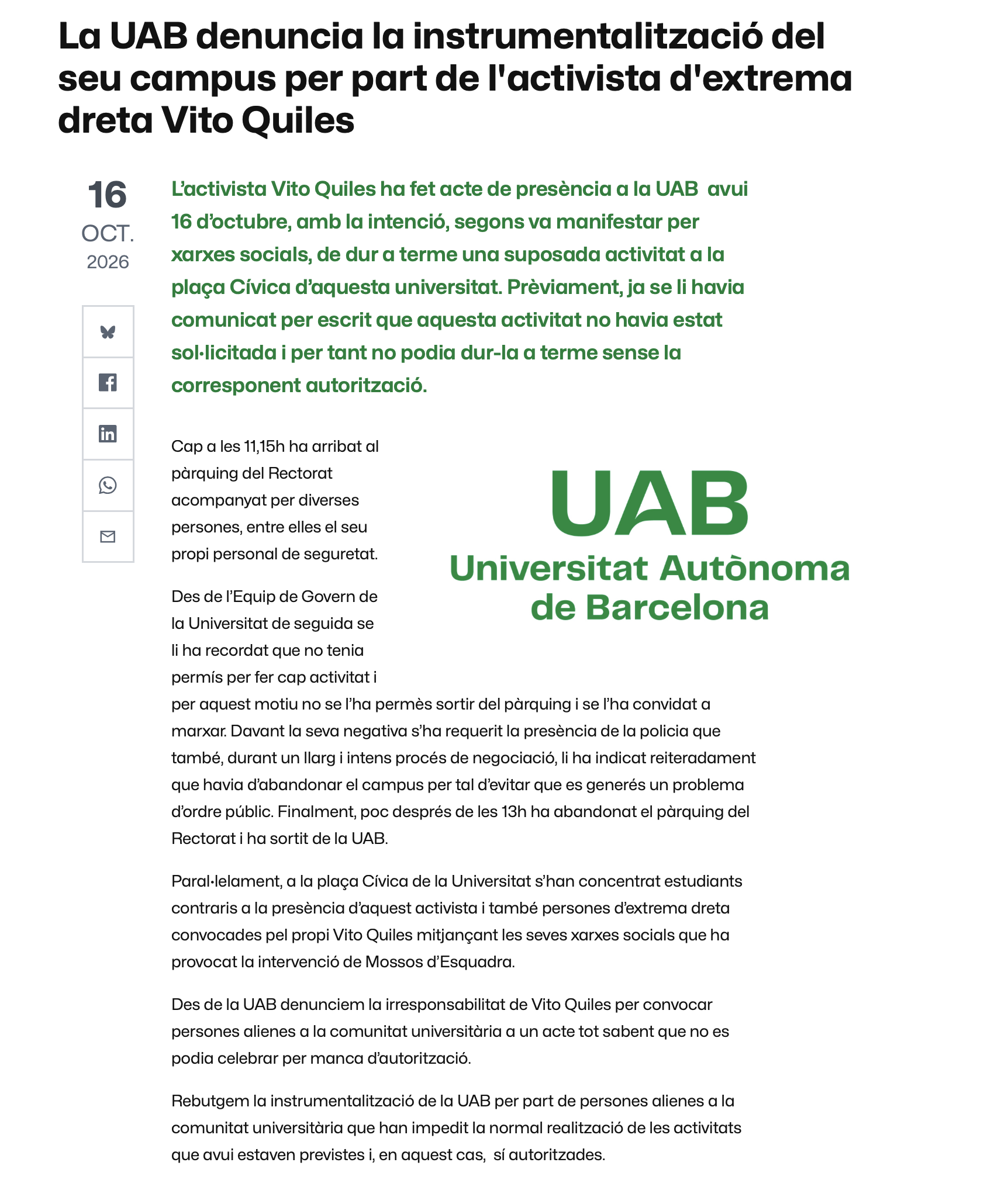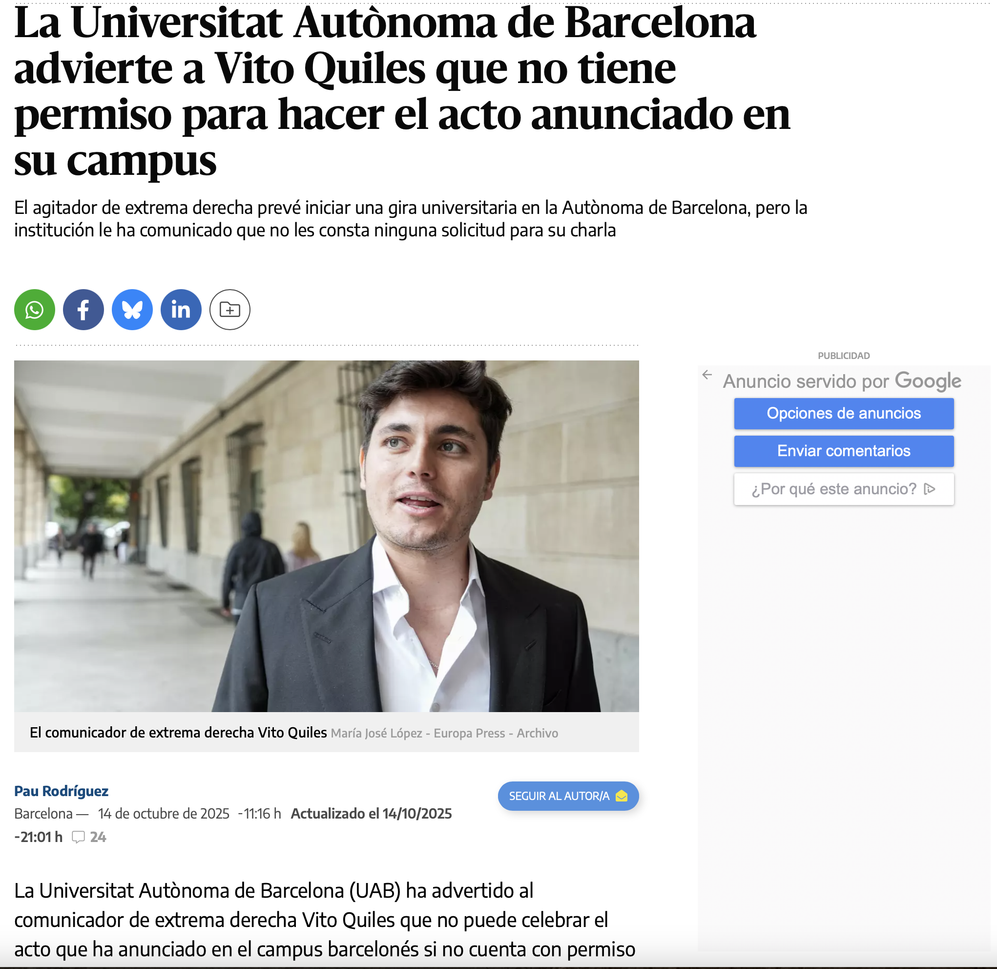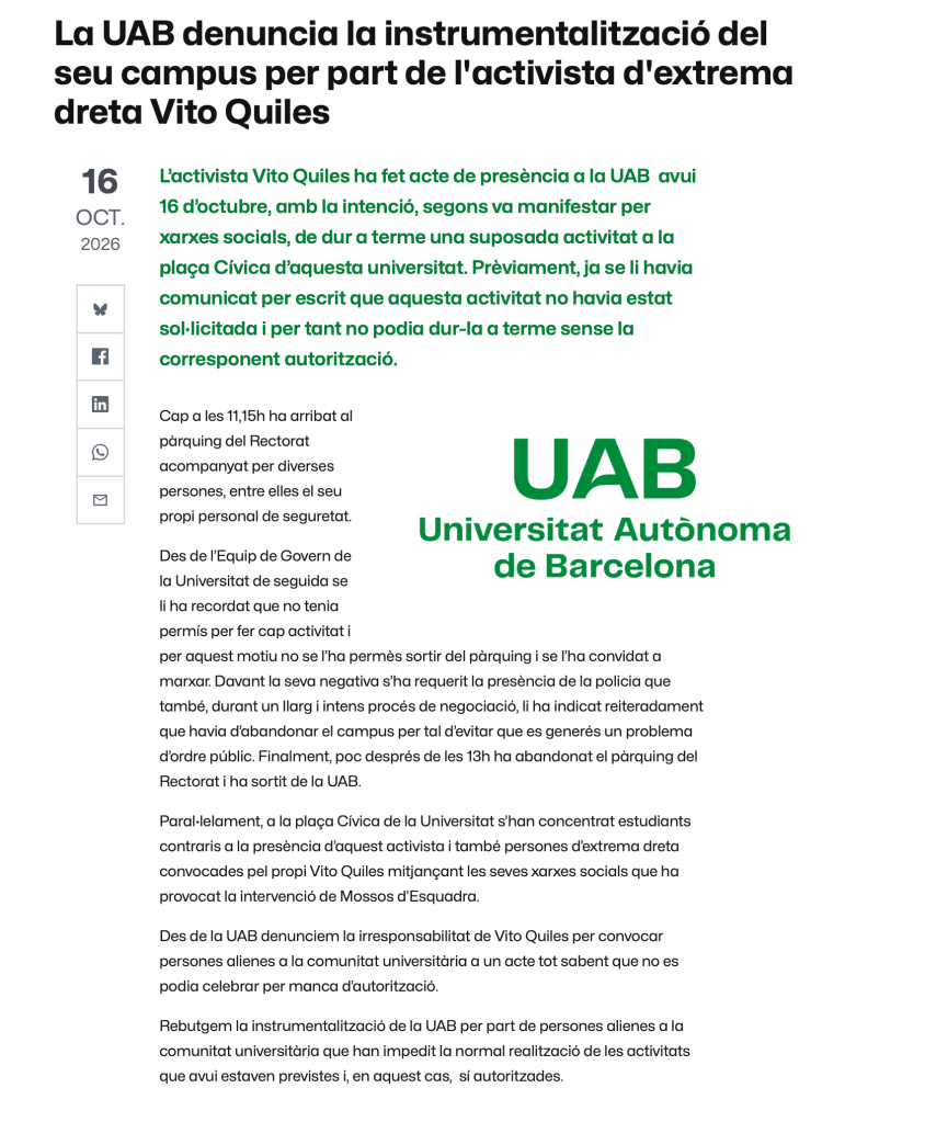 Vito Quiles, un «comunicador» (como se dice ahora) había anunciado una gira por varias Universidades españolas. El primer acto iba a tener lugar en mi propia Universidad (la UAB) y fui testigo bastante directo de lo que pasó (lo comentaba en la segunda parte de esta entrada de hace unos días).