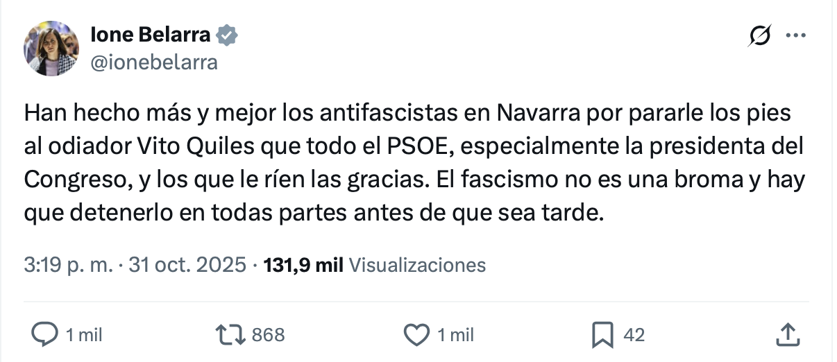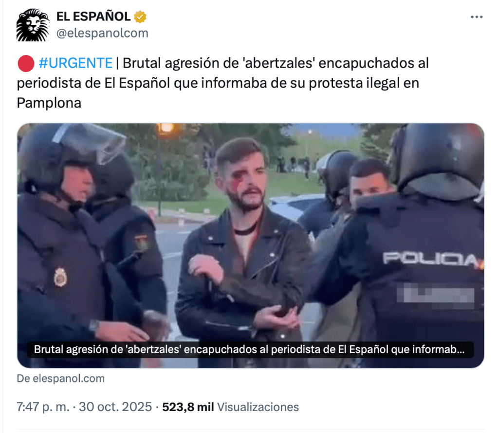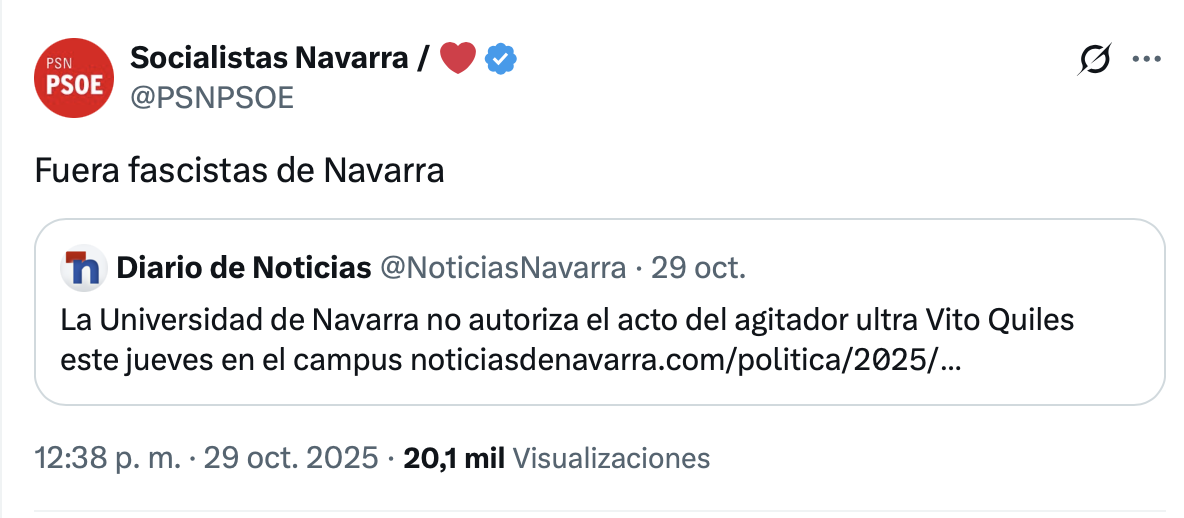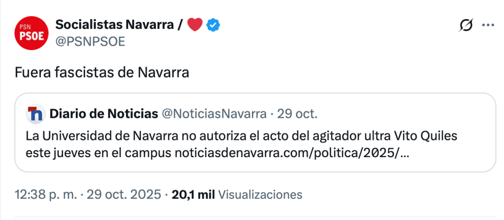 No parece haber excesivas dudas de que quienes agredieron al periodista formaban parte de grupos de izquierda abertzale; esto es, de los que se oponían a la presencia de Vito Quiles en el campus y que, por tanto, coincidían en los planteamientos de los grupos «antifascistas» que habían intentado impedir la presencia de Quiles en otros campus. Por otra parte, en el primer tweet que compartía veíamos cómo el PSOE en Navarra vinculaba el acto de Quiles al fascismo, al introducir la noticia de que se había prohibido dicho acto con una frase que plantea pocas dudas: «Fuera fascistas de Navarra«.